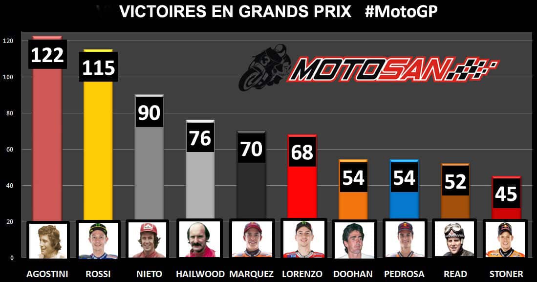 Quand on parle exclusivement de la catégorie reine, Marc Márquez s’en sort encore mieux. Avec sa cinquième victoire en 2018, il a égalé Mick Doohan en tant que troisième pilote avec le plus grand nombre de titres en MotoGP/500cc, derrière Rossi avec 7 et Agostini avec 8.