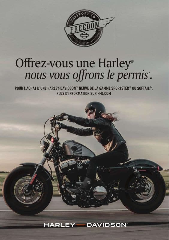 – 3. Être (plus) libre de vivre intensément : Harley-Davidson participe au financement de la formation de conduite sous forme de remise commerciale à l’achat d’un modèle Sportster® ou Softail® neuf chez le concessionnaire participant.