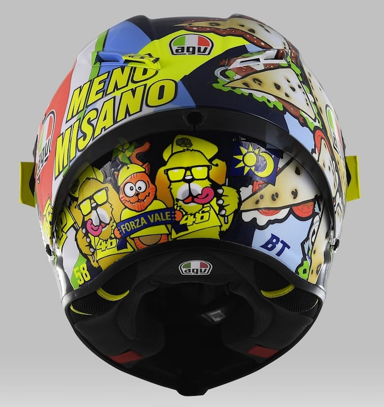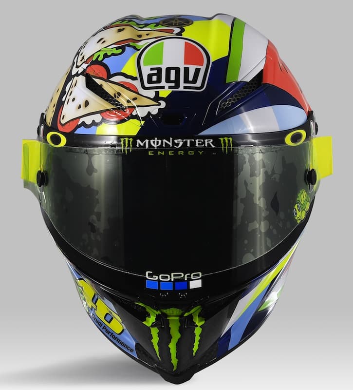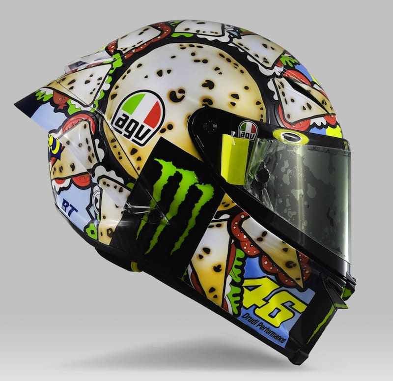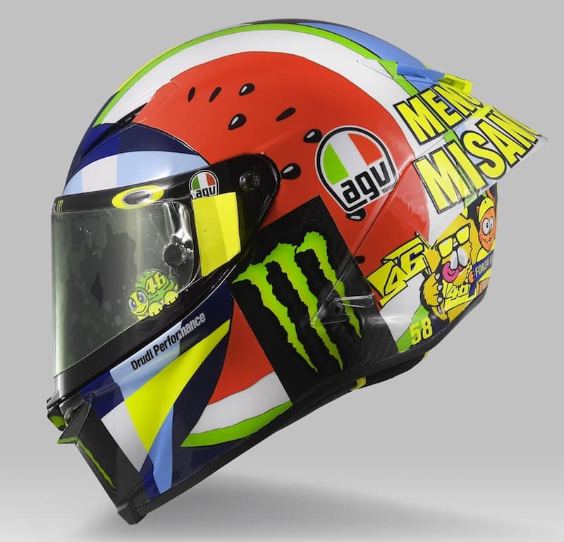 « Menu Misano », le dernier casque de Valentino Rossi rend hommage à la course de Misano mais aussi aux traditions locales, reprenant les deux symboles phares du Dottore à savoir le soleil et la lune prenant respectivement la forme d’une « piadina » et d’une tranche de pastèque blanche, rouge et verte ;