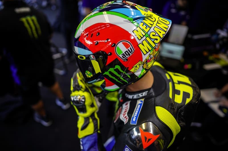 « Menu Misano », le dernier casque de Valentino Rossi rend hommage à la course de Misano mais aussi aux traditions locales, reprenant les deux symboles phares du Dottore à savoir le soleil et la lune prenant respectivement la forme d’une « piadina » et d’une tranche de pastèque blanche, rouge et verte ;