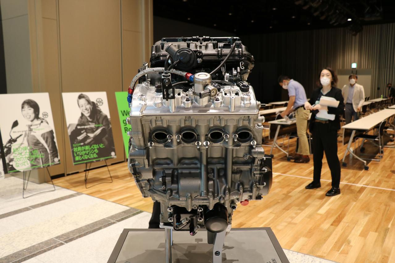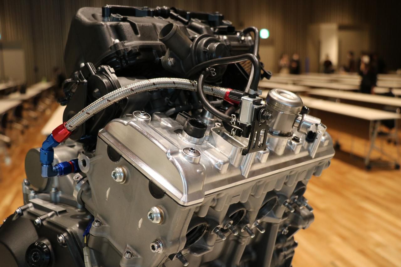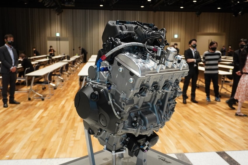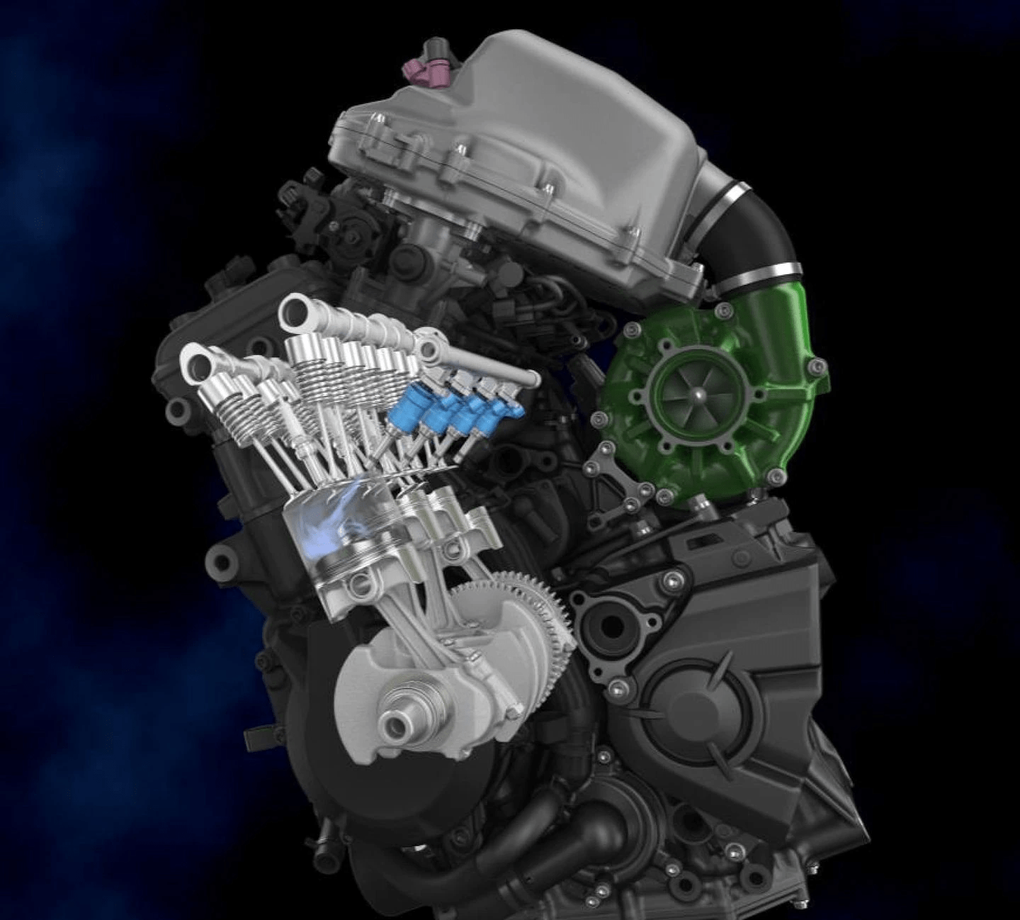 Le moteur prototype présenté par Kawasaki n’est pas alimenté à l’hydrogène, du moins pas encore. Initialement, il s’agit d’une conception à double injection, combinant l’injection de carburant classique, comme celle utilisée dans le moteur de la H2, avec l’injection directe d’essence à haute pression. Ce dernier permet de réduire les émissions : le carburant est injecté après la fermeture de la soupape d’échappement afin qu’aucun carburant imbrûlé ne s’échappe du cylindre, et il refroidit également la chambre de combustion pour aider à limiter le cliquetis, ce qui permet d’utiliser des taux de compression plus élevés et un mélange air-carburant plus pauvre.