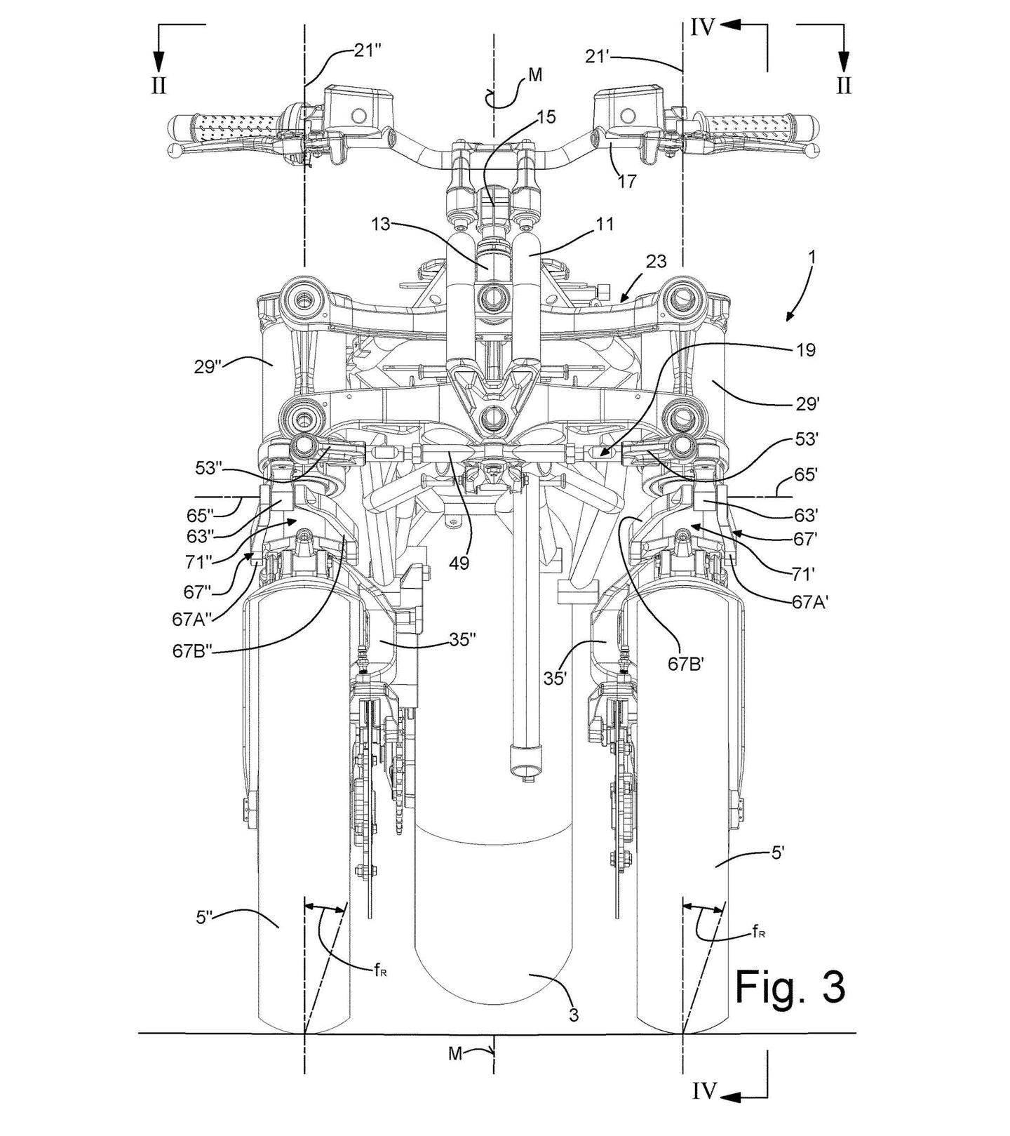 Les nouveaux brevets confirment que la géométrie d’inclinaison de style parallélogramme demeure, mais les liaisons de style ciseaux aident désormais les jambes télescopiques à suspendre le tricycle. Aprilia ne met cependant pas tous ses œufs dans le même panier, offrant également une conception qui utilise une rotule au sommet de la jambe de force tandis qu’un seul lien de direction renforce la partie inférieure. Piaggio, la société mère d’Aprilia a créé un système d’inclinaison parallélogramme avec son scooter MP3, mais Aprilia garde toutes ses options sur la table.