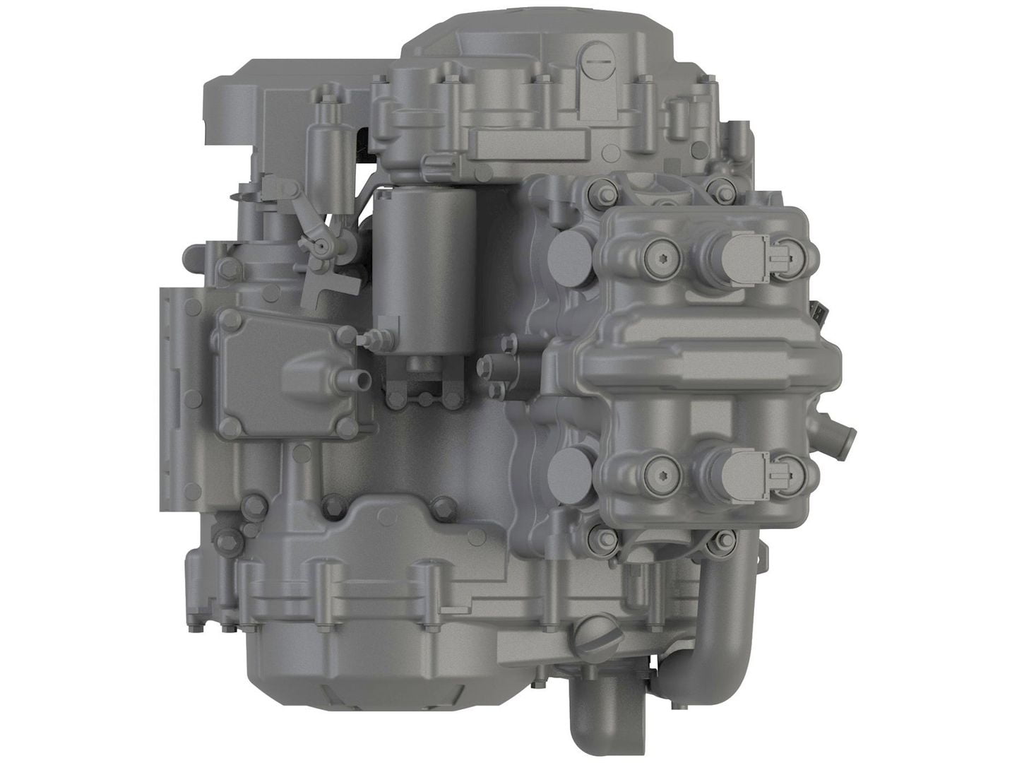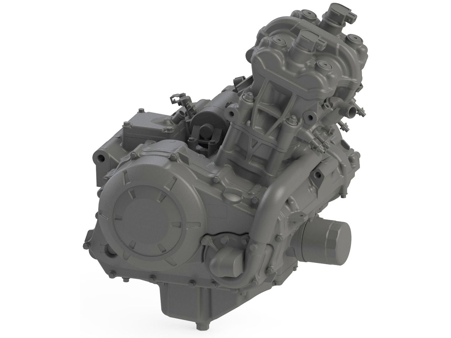 Le nouveau moteur présenté dans ces rendus CAO est un bicylindre DACT qui diffère de la norme en utilisant un entraînement à came centrale entre les cylindres plutôt que d’un côté. Ce n’est pas totalement inhabituel, car le CBX de 1 000 cc de Honda avait sa chaîne à cames au milieu, le V4 du VFR400R utilisait des arbres à cames entraînés par engrenages avec les engrenages de distribution entre les cylindres, et le moteur MotoGP YZR-M1 de Yamaha fait le même, mais c’est beaucoup moins courant que d’autres conceptions.