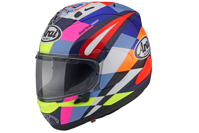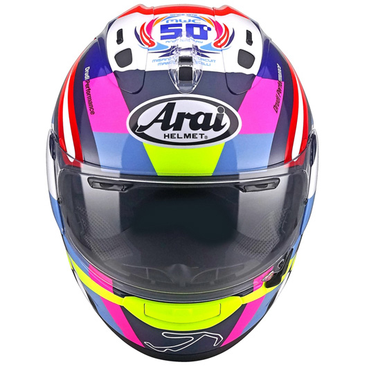À l’occasion du cinquantenaire du circuit de Misano, Arai dévoile une version en édition limitée imaginée par les équipes d’Aldo Drudi et qui reprend certains éléments graphiques caractéristiques.