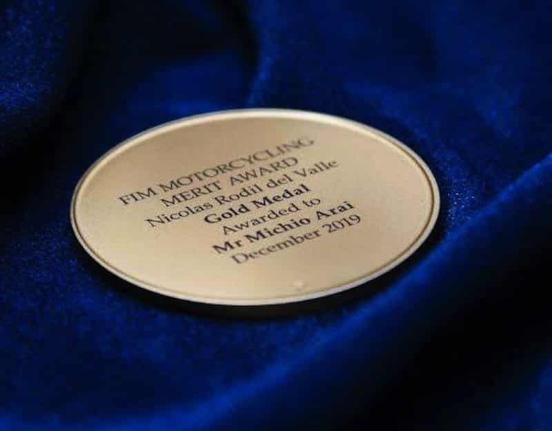 Pour ce millésime 2019 c’est à Michio Arai, président de Arai Helmet Ldt depuis 1986 et fils du fondateur de la marque, qu’a été décerné la médaille d’or nommée Nicolas Rodil del Valle (président de la FIM de 1965 à 1983) pour « ses contributions à la sécurité apportées aux nombreux pilotes et ses nombreuses avancées techniques dans le sport moto au fil des années. »