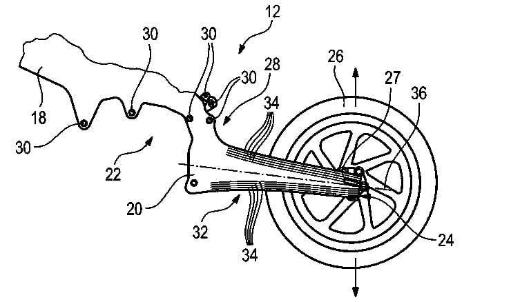 Cependant, le dernier brevet de BMW sur le sujet montre une approche radicalement nouvelle en intégrant le bras oscillant au châssis principal, éliminant ainsi le besoin d’un pivot de bras oscillant. La fibre de carbone peut être conçue pour être rigide dans une direction et flexible dans une autre, ce qui permet un bras oscillant qui se plie pour absorber les bosses mais qui reste rigide latéralement. Un ressort et un amortisseur conventionnels seraient toujours utilisés, permettant à la suspension d’être réglée, mais le carbone fournirait une proportion de l’effet de ressort.