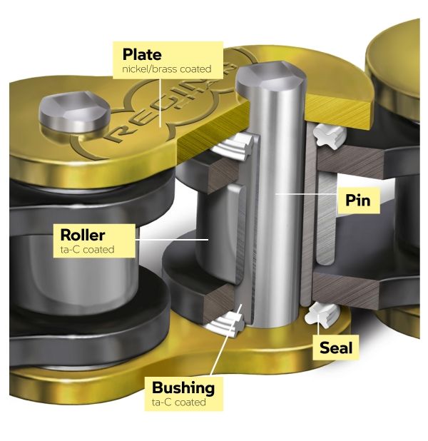 En d’autres termes, cette chaîne de moto BMW est sans entretien. La chaîne M Endurance possède également, comme les chaînes X-ring standards, un lubrifiant permanent entre les rouleaux et les axes, entouré par des anneaux X-rings. Mais elle dispose d’un nouveau matériau de revêtement pour les rouleaux qui entourent les axes – le carbone tétraédrique amorphe (ta-C) qui ne s’use pas grâce à ses caractéristiques de dureté et de résistance extrêmes. En outre, ce matériau révolutionnaire offre d’autres avantages comme un faible coefficient de frottement, ce qui augmente les performances. En conséquence, la lubrification de la chaîne, le nettoyage et la remise en tension habituels ne sont plus nécessaires.