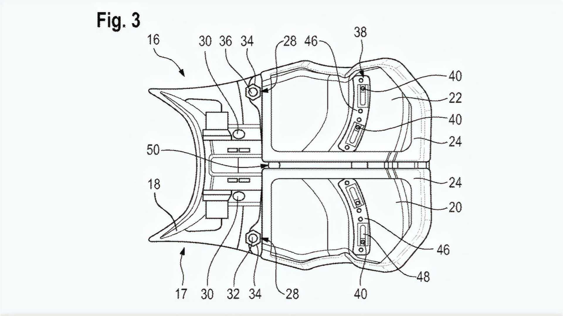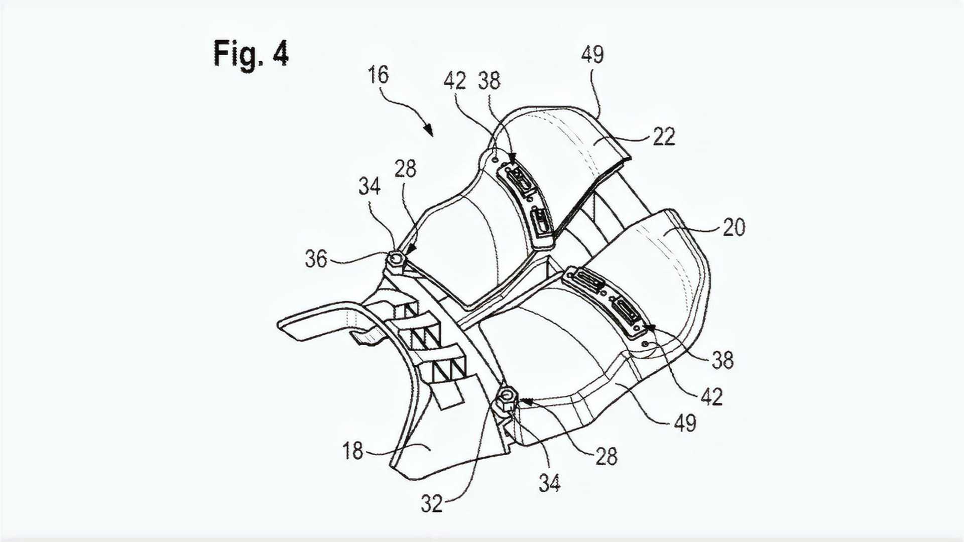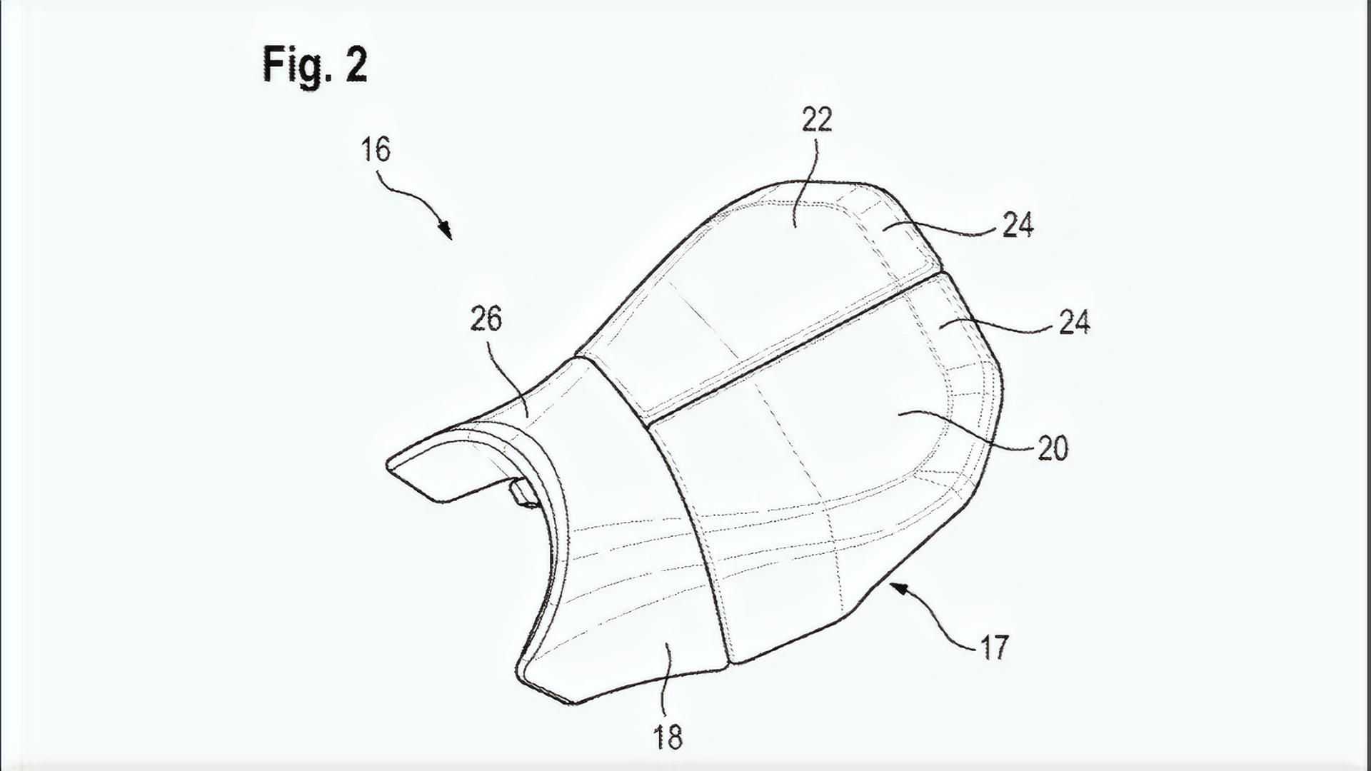 Les images sont explicites, représentant une selle composée de trois sections plutôt qu’un seul morceau de mousse. L’élément avant est fixé comme d’habitude, s’ajustant parfaitement à l’arrière du réservoir de carburant, mais derrière il se trouvent deux éléments latéraux mobiles, un pour chaque côté. En mode standard, cela ressemble à une selle normale, avec juste quelques coutures supplémentaires séparant les sections. Mais une fois les entrailles dévoilées, le brevet révèle que les deux sections arrière peuvent pivoter. Cela signifie que les moitiés arrière peuvent être basculées vers l’extérieur jusqu’à quelques centimètres, ce qui élargit considérablement la section arrière de la selle.