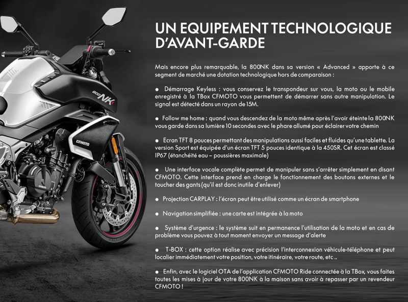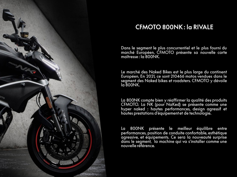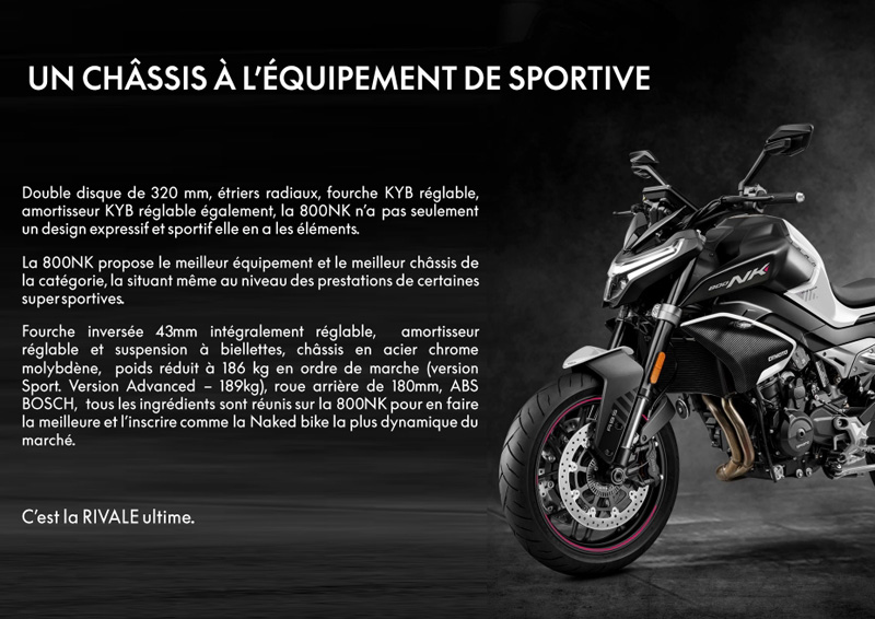 La 800NK représente l’évolution ultime de la technologie et de la conception produits de CFMOTO, seul constructeur Chinois à être présent en MotoGP avec un team permanent en Moto3.