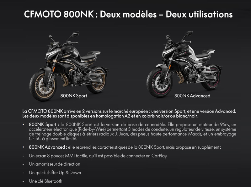 Deux versions arrivent simultanément sur le marché avec un accès à la gamme à 7 490 € pour le modèle Sport et une version Advanced à 8 690 € avec quick shifter up & down, tablette d’instruments de 8 pouces intégrant Tbox et positionnement GPS continu, amortisseur de direction et clé bluetooth… Chaque version étant disponible en homologation A2.