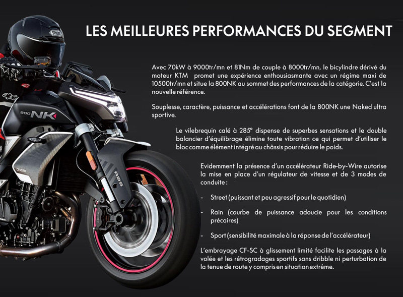 Pour prétendre à la tête du segment roadsters sportifs moyenne cylindrée, la 800NK dispose de nombre d’arguments dynamiques et techniques : un bicylindre en ligne de 799 cm3 développant 95 ch et 81 Nm, avec un embrayage anti dribbles CF-SC, pour un poids de 186 kg (version Sport), et est dotée d’un équipement technologique de premier plan avec suspensions Kayaba, injection Bosch, etc ..