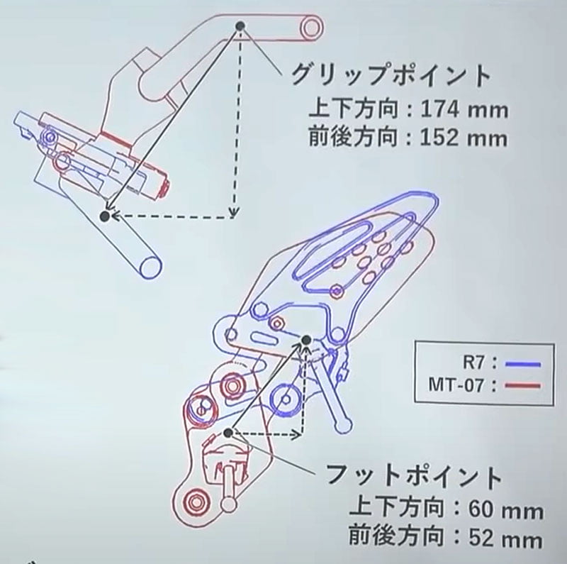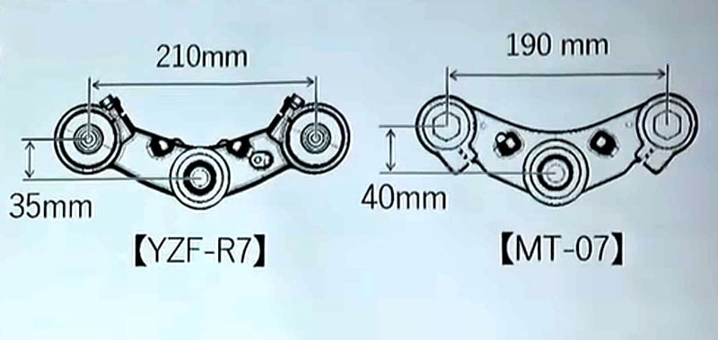 S’ensuit un focus sur les tés de fourche qui a son importance. En plus de l’entraxe des tubes de fourche passe de 190 à 210mm, le déport se réduit de 40 à 35 mm, entraînant une nouvelle et inversée répartition des masses: centrage sur l’arrière à 50,6% pour la MT-07, sur l’avant à 50,7% pour la R7. Du coup, l’empattement se réduit aussi de 5 mm, à 1395mm. Les pilotes apprécieront…