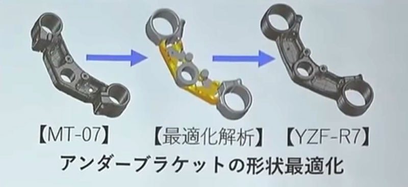 Mais il ne suffit pas d’adopter une position de pilote sur une moto aux suspensions et freins renforcés pour en faire une sportive, donc Yamaha a également augmenté la rigidité de sa partie-cycle. Tout d’abord par l’optimisation du té de fourche inférieur grâce à une étude en CAO et une réalisation en aluminium forgé…