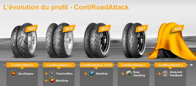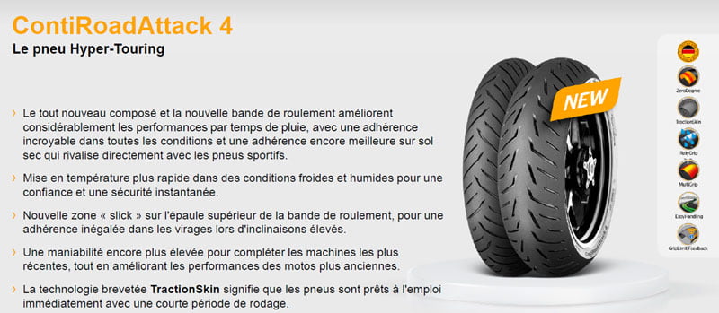 Après avoir remporté plusieurs tests avec le ContiRoadAttack 3, Continental rehausse le niveau de technicité de son pneumatique premium en introduisant sur le marché le nouveau ContiRoadAttack 4, résultat d’un développement permanent de la part du manufacturier. Côté Touring ce sont trois importantes caractéristiques qui ont été le centre de toutes les préoccupations des ingénieurs allemands pour répondre aux attentes du marché : l’adhérence sur route humide, la montée rapide en température, et enfin le comportement routier avec la maniabilité et la stabilité.
