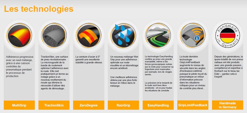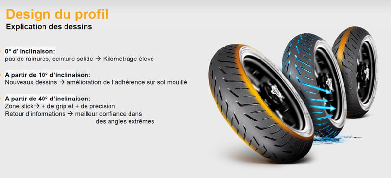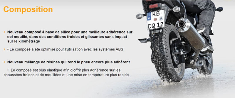• Technologie MutliGrip: adhérence continue et homogène lors de la mise sur l’angle, plus de rendement kilométrique sur la bande de roulement