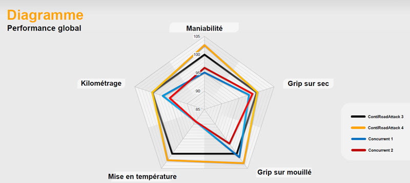 En conclusion, outre l’hypersportivité du modèle poussée à son paroxysme avec l’intégration de la technologie GripLimit Feedback, la quatrième génération du ContiRoadAttack progresse plus particulièrement sur trois points. Trois critères fondamentaux selon Continental et qui caractérisent les pneumatiques moto premium. Une montée rapide en température tout d’abord afin d’obtenir un pneumatique performant après quelques secondes d’utilisation. Mais aussi un grip élevé sur le mouillé pour un pilotage sûr et, enfin, une aisance étonnante et durable de par sa conception et son profil, répondant ainsi aux nouvelles exigences des puissantes machines modernes et leurs systèmes d’aide à la conduite.