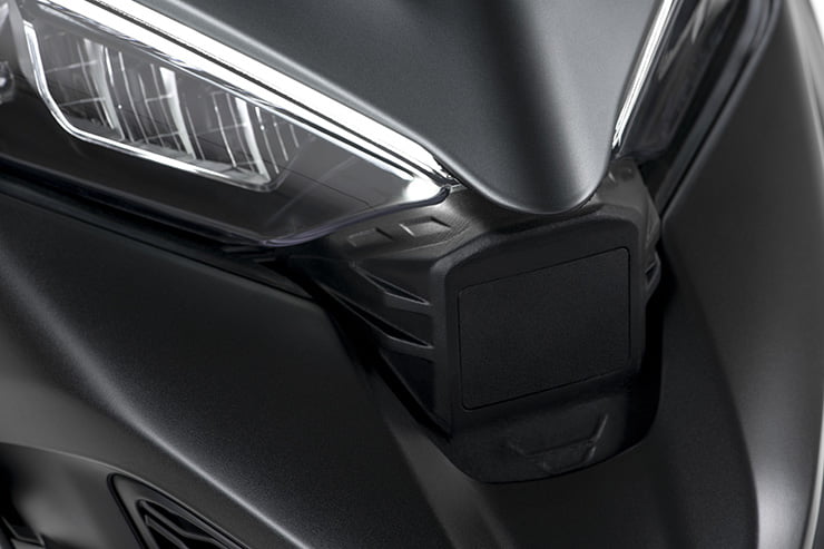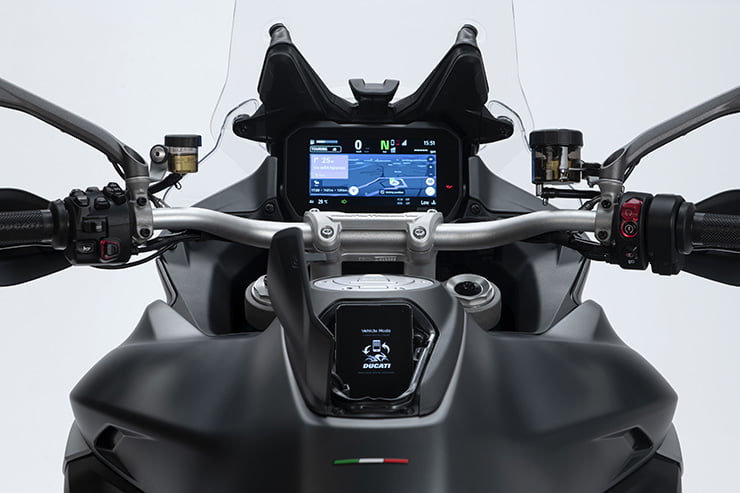 Là où le système de la Multistrada diffère vraiment de la configuration BMW, c’est le radar arrière supplémentaire, qui offre une détection d’angle mort – éclairant des LED d’avertissement dans le rétroviseur approprié lorsqu’un véhicule entre dans votre angle mort, lorsque vous souhaitez de changer de voie.