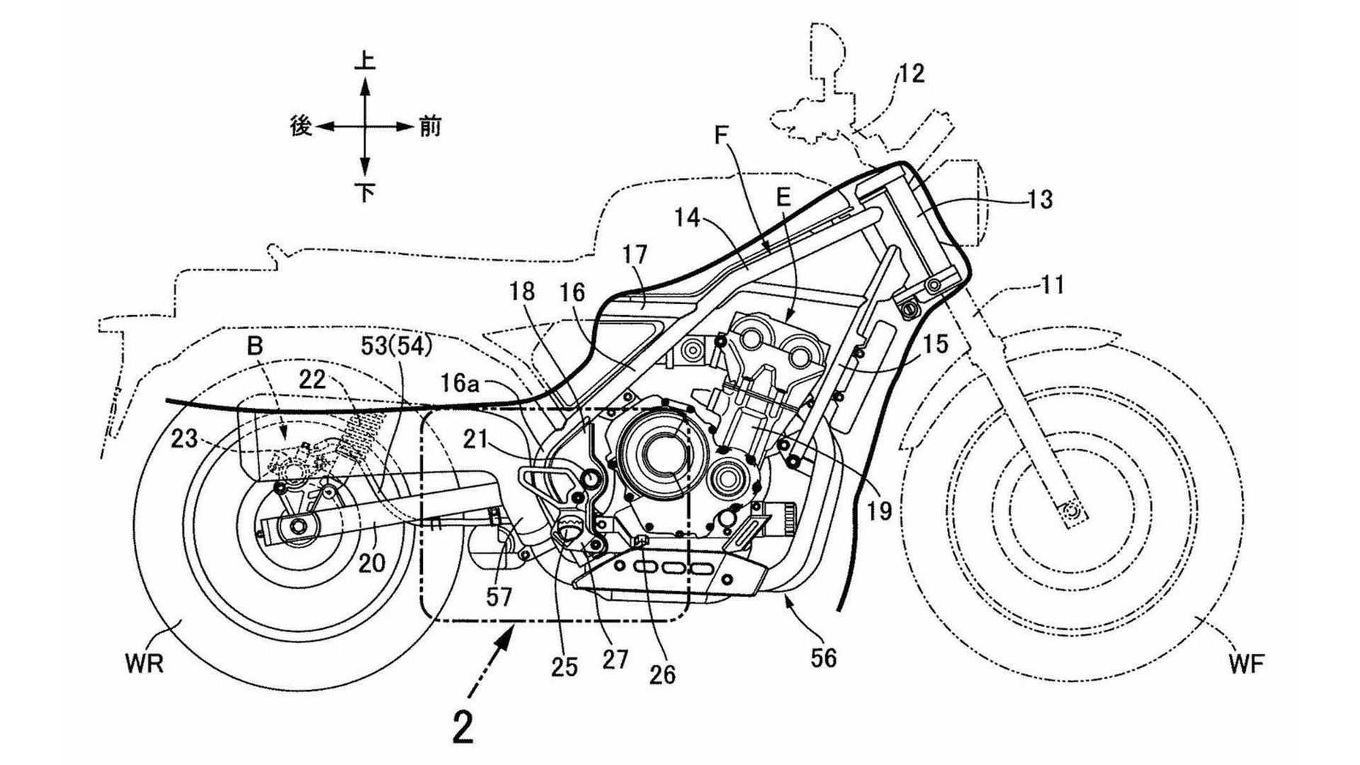 Un examen plus approfondi de la moto dans les dessins de ce brevet montre que le moteur est le bicylindre en ligne provenant du CB500, bien connu chez Honda car installé dans une multitude de modèles, et le cadre est fondamentalement le même que celui du Rebel mais avec tout de même quelques adaptations techniques, pour s’adapter à la selle et permettre d’installer des amortisseurs arrière plus longs afin d’autoriser un plus grand débattement de la suspension arrière.