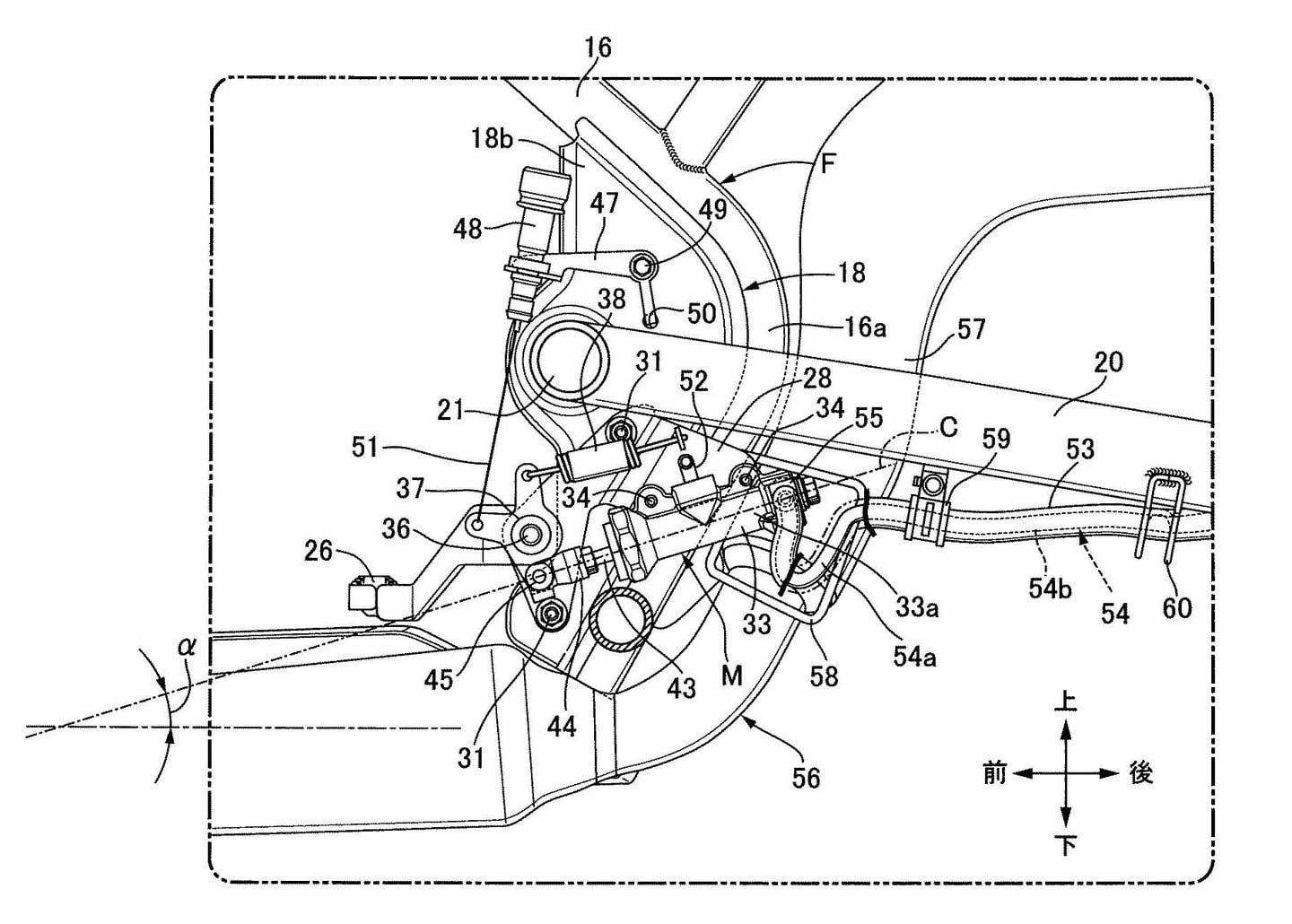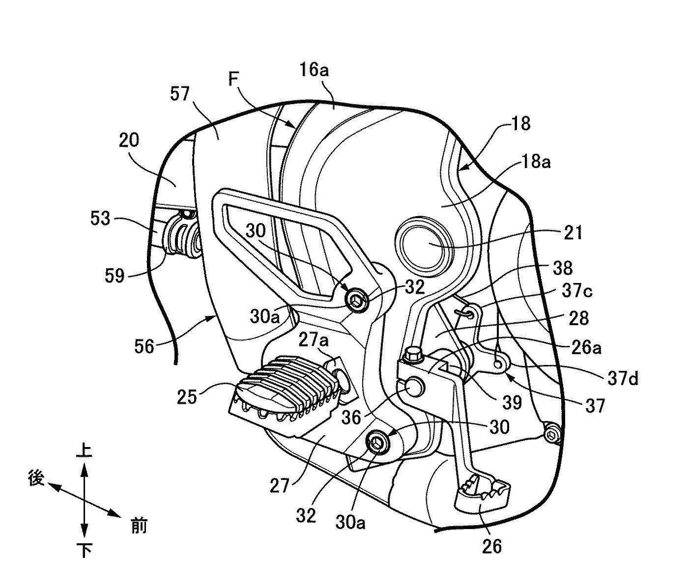 La solution paraît simple. Le brevet montre des repose-pieds montés sur une nouvelle plaque en alliage qui est boulonnée directement sur les supports existants sur le cadre, mais cela introduit un nouveau problème d’ingénierie lorsqu’il s’agit d’intégrer le maître-cylindre de frein arrière et le contacteur de feu stop. Le brevet déposé en 2019 par Honda a résolu ces problèmes.
