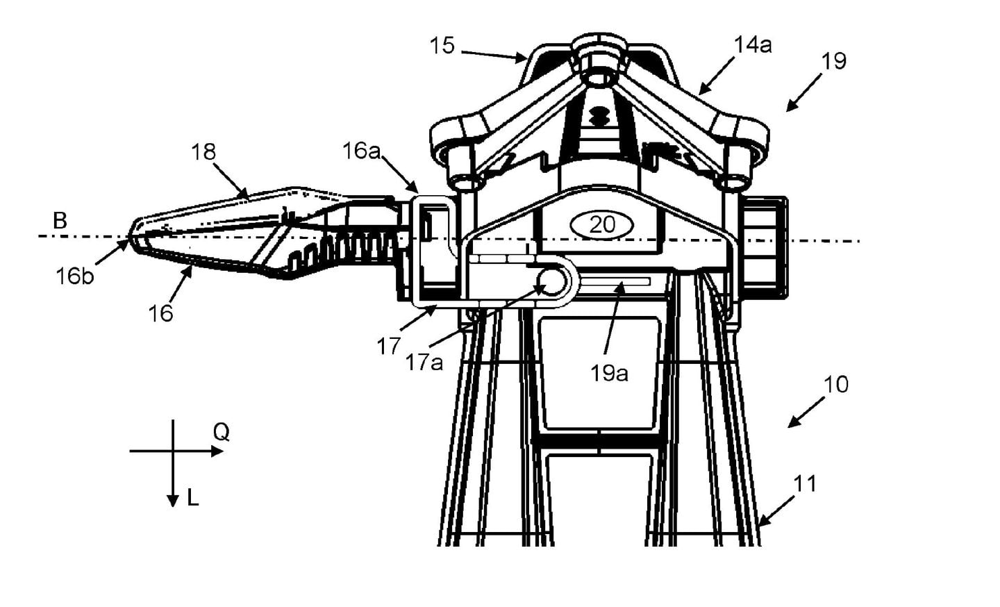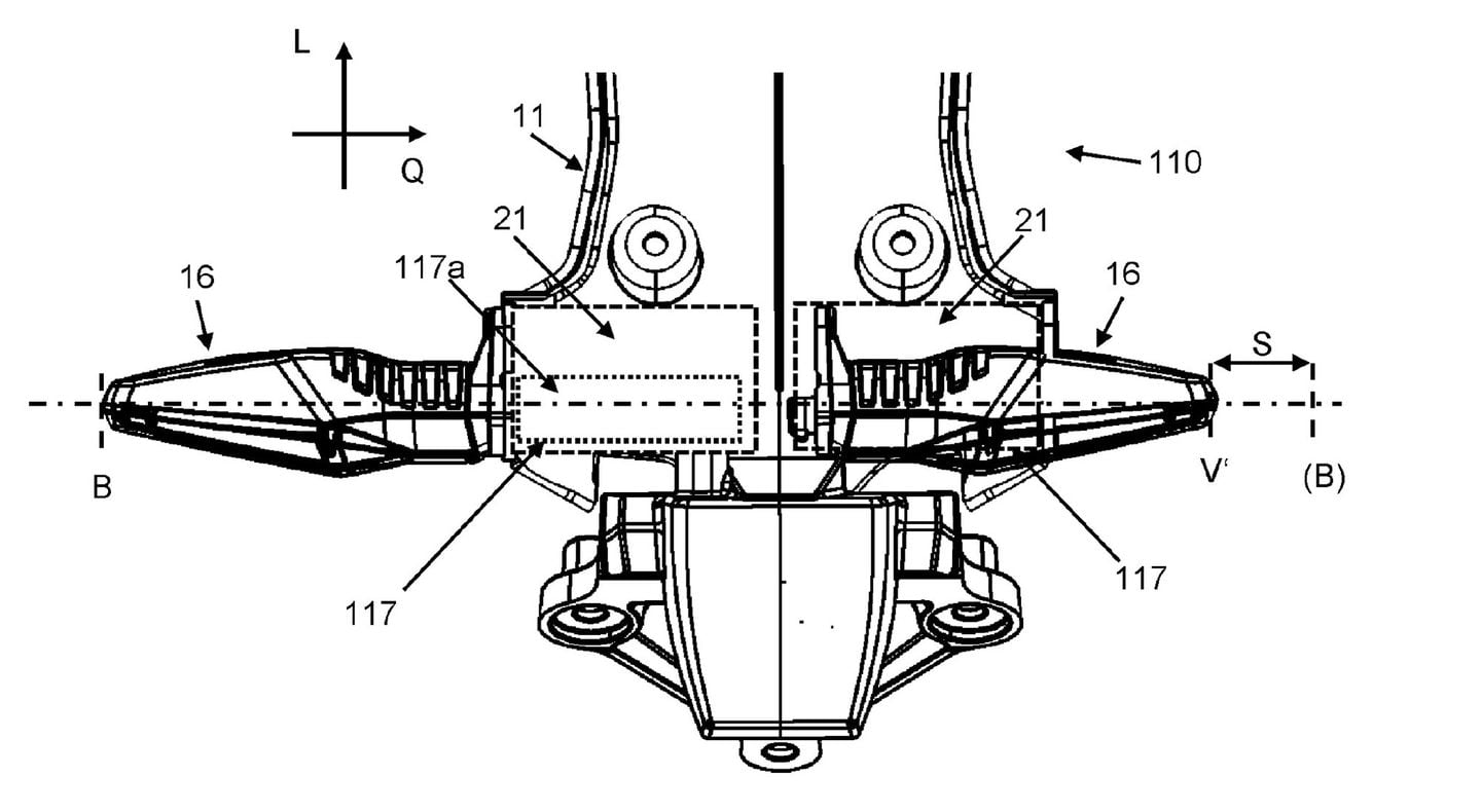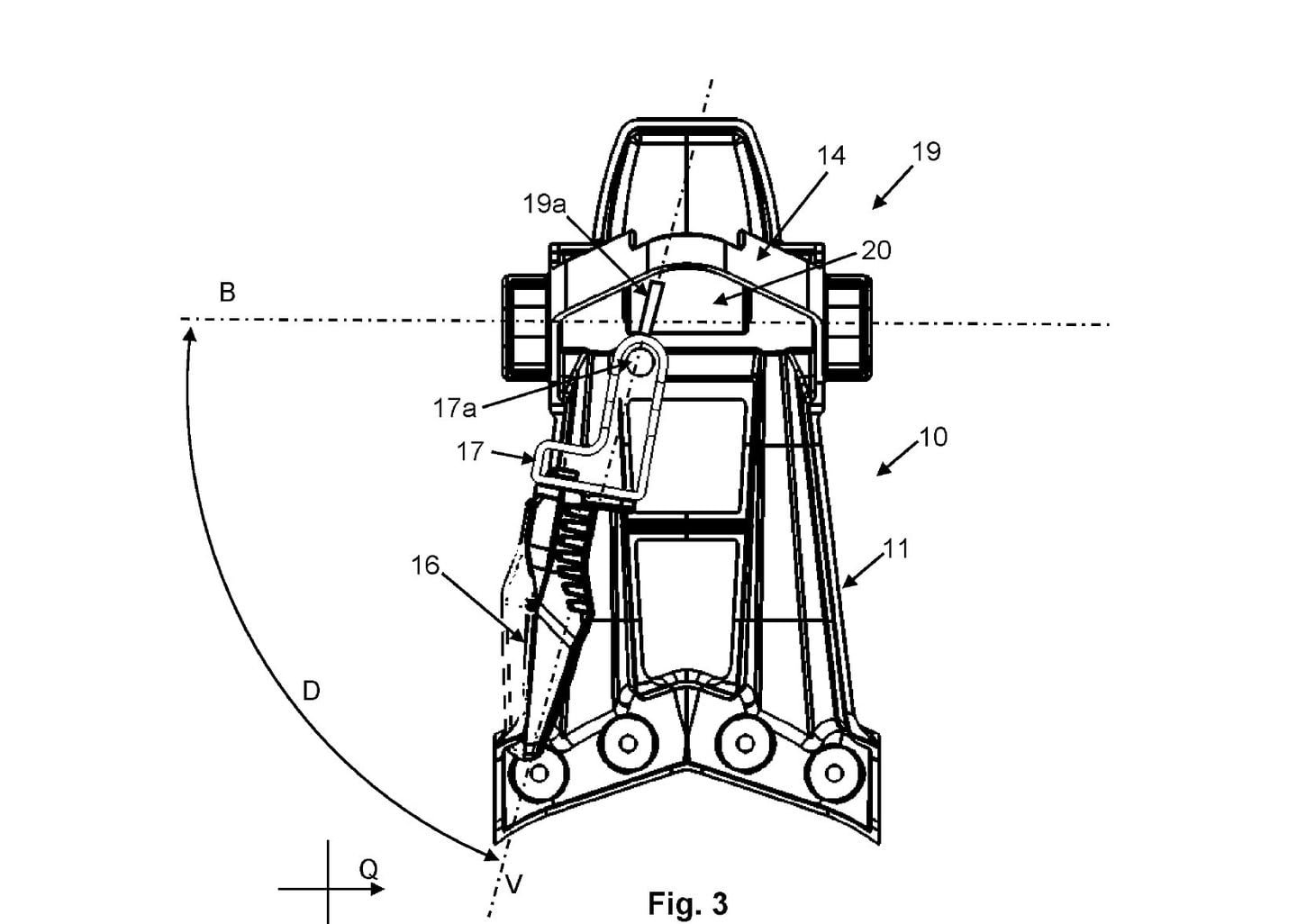 La plus simple des deux conceptions présentées dans le brevet de BMW intègre des pivots à la base des supports de clignotants, leur permettant d’être basculés manuellement vers l’avant où ils se clipsent le long du support de plaque d’immatriculation. Comme variante de cette idée, BMW montre des extensions intérieures sur les clignotants pivotants (marqués 19a ci-dessous) qui se projettent vers l’arrière lorsque les clignotants sont basculés en position tout-terrain. Ces extensions sont destinées à dépasser là où la plaque d’immatriculation serait normalement, permettant uniquement aux clignotants d’être mis en mode tout-terrain lorsque la plaque d’immatriculation est retirée, vraisemblablement pour empêcher les conducteurs de rouler par inadvertance dans la rue avec les clignotants dans la position repliée.