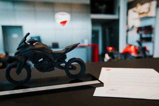 Pour célébrer cette occasion, M. Lebensieg a été invité chez le concessionnaire d’Ingolstadt par Ducati Motor Deutschland, où il a reçu une reproduction sculpturale de la Multistrada V4 avec une lettre personnelle certifiant le numéro de série de la moto.
