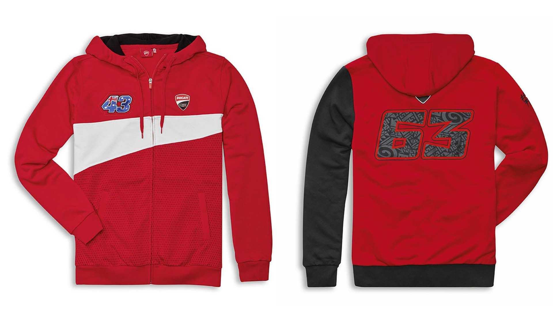 Pour rendre cette nouvelle collection encore plus unique, il existe une série de produits personnalisés aux couleurs des deux pilotes officiels de l’équipe, l’Italien Pecco Bagnaia et l’Australien Jack Miller. Celle-ci comprend des t-shirts à 39€, des sweats à capuches au tarif de 88€, et des casquettes à 30€ incluant les numéros 43 pour l’Australien et 63 pour l’Italien.