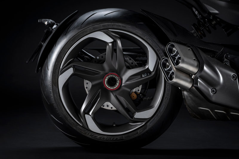 Les lignes décisives et agressives du Diavel V4 ont également été profondément revues à travers les composants techniques : de nombreux éléments caractéristiques de la Batur sont repris dans différentes parties de la moto. Les jantes forgées, conçues et créées pour cette moto, rappellent les formes de celles de la voiture et sont peintes en Dark Titanium Satin, laissant apparaître quelques surfaces usinées.