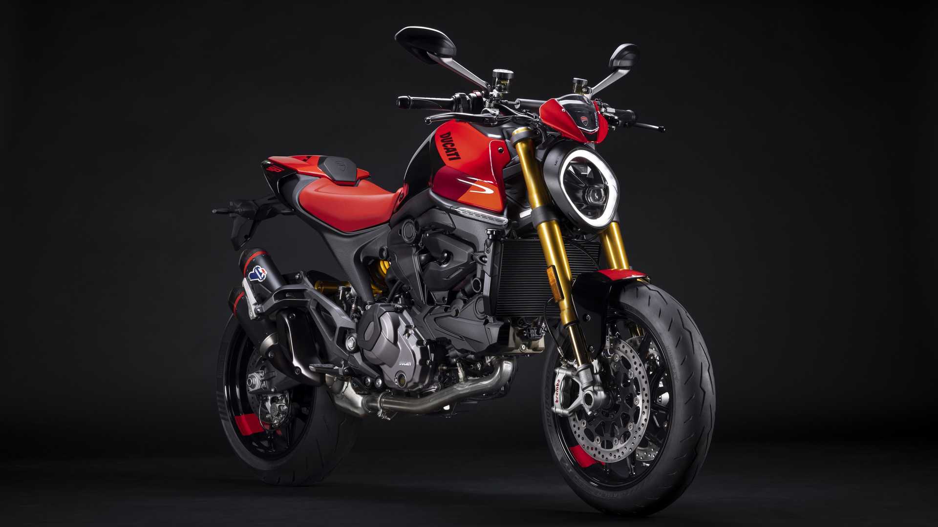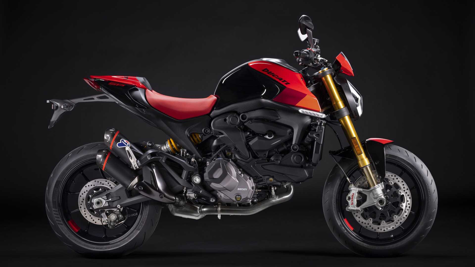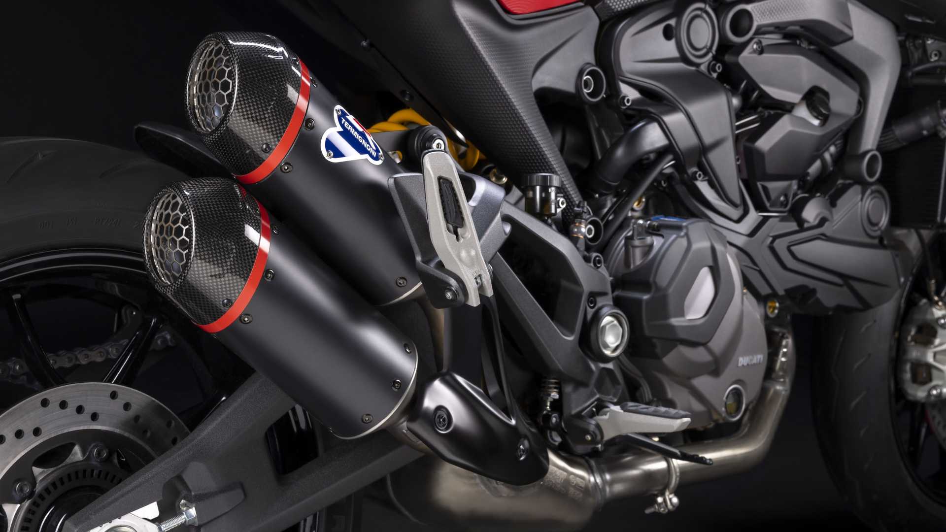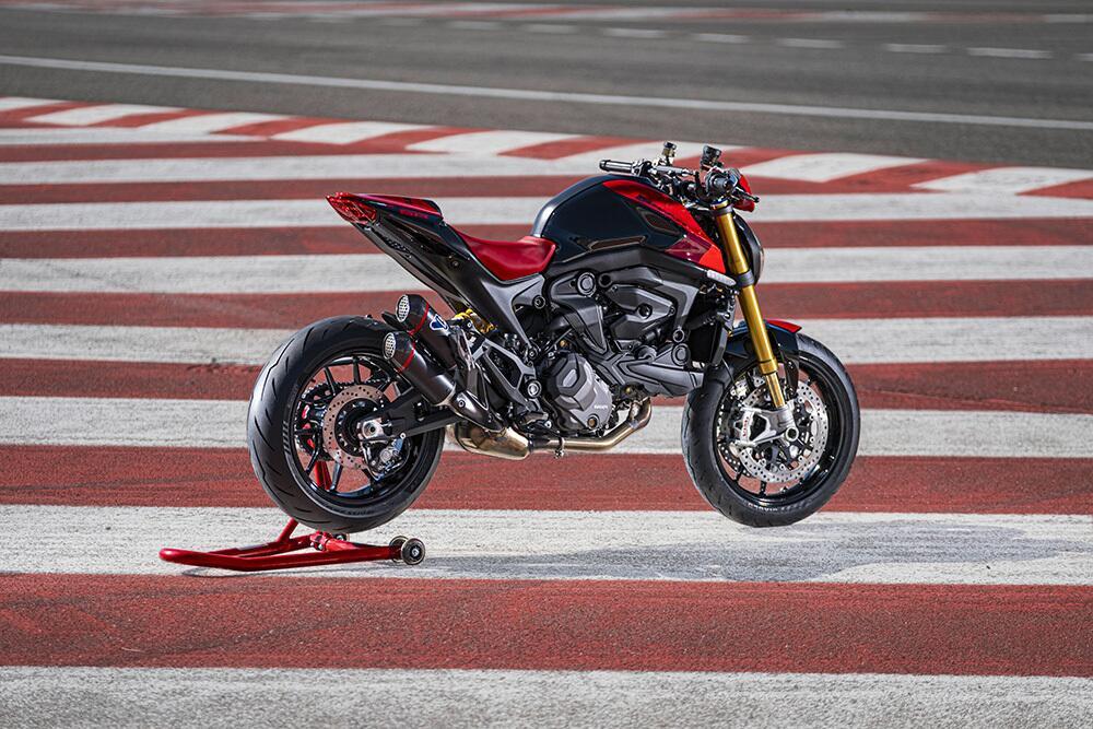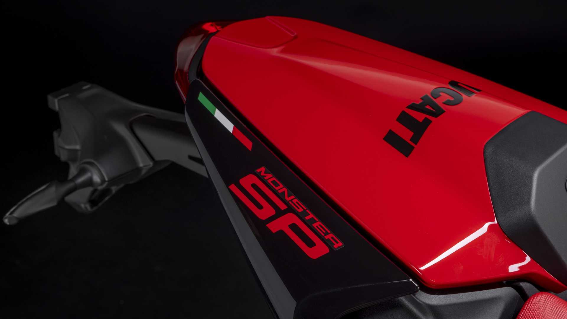 Le Monster SP véhicule son âme sportive au premier regard : déjà évoqué à propos du carénage avant, de la livrée qui reprend les couleurs de la Desmosedici MotoGP et des fourreaux de fourche couleur or, la selle est rouge et de petits changements ont également été fait sur les graphiques. Plus de qualité également dans l’échappement, avec un silencieux Termignoni homologué qui ajoute une pointe de piquant tout sauf ignoble.