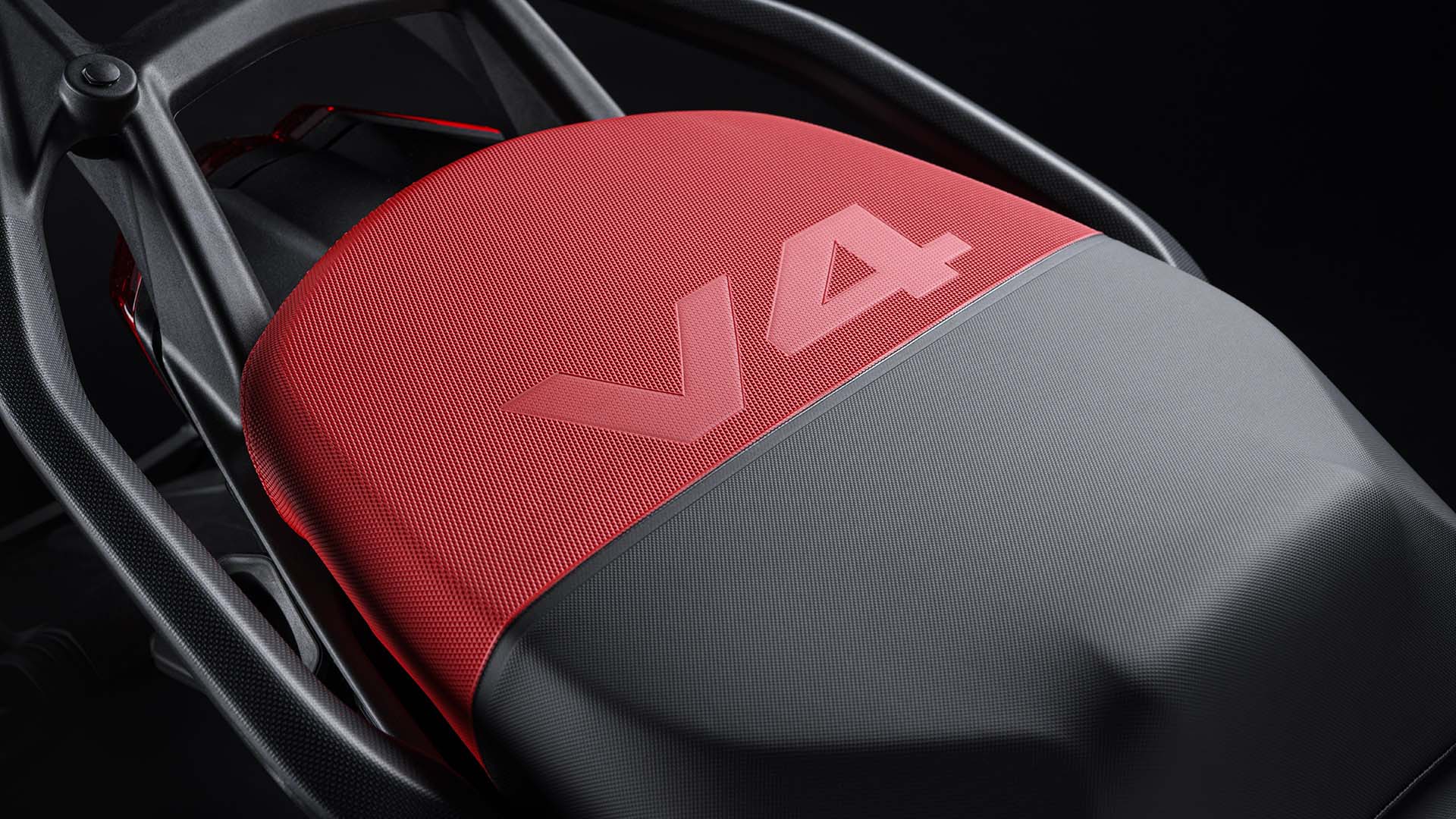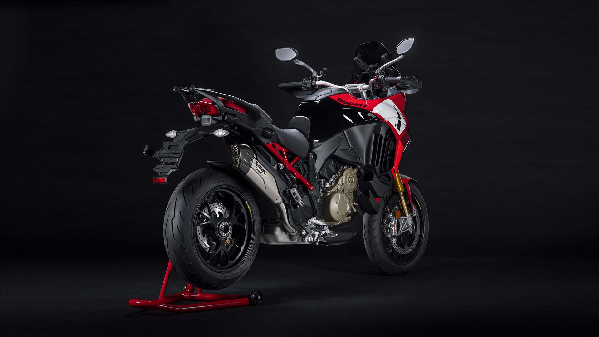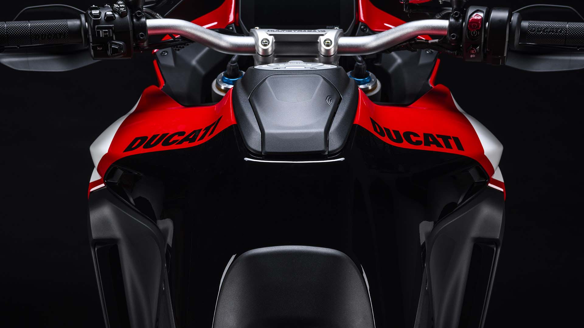 Le design prend forme à partir des éléments classiques de la famille Multistrada V4 combinés aux aspects qui caractérisent et identifient la version Pikes Peak, à savoir la roue avant de 17 pouces et le monobras oscillant. La forte orientation compétition de la moto est soulignée par la livrée spéciale « Pikes Peak » inspirée des couleurs et des graphismes de la Desmosedici GP21, avec les plaques numéro dessinées des deux côtés du réservoir qui accentuent le lien avec le monde de la course. Mais le tempérament racing se manifeste aussi par les nombreuses pièces en fibre de carbone, du silencieux homologué Akrapovic en titane et carbone, de la fourche Ohlins, de la selle bicolore et qui arbore le logo V4 et, enfin, par le logo Ducati Corse appliqué sur le garde boue avant.