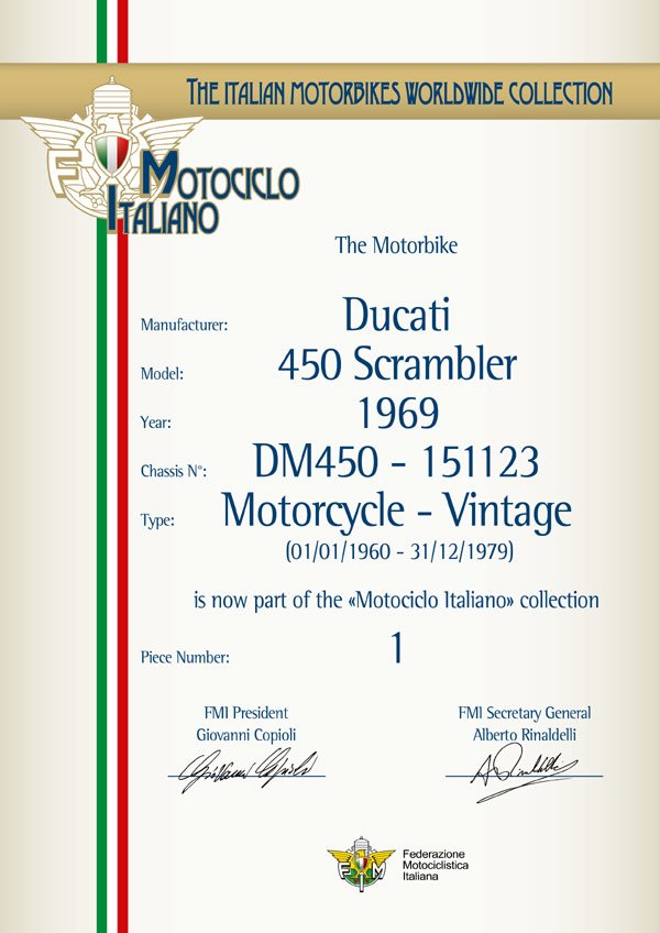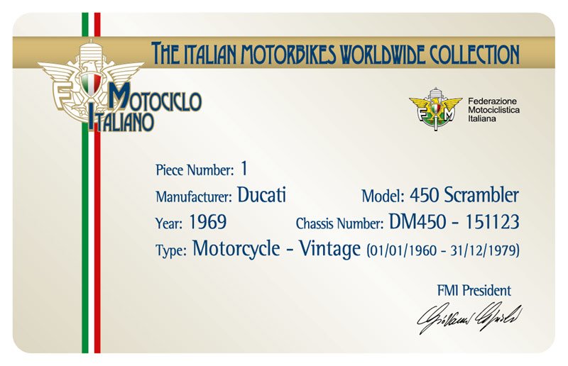 En enregistrant votre moto sur Motociclo Italiano, vous lui conférerez un plus grand prestige, en obtenant des avantages importants: vous recevrez un paquet dédié avec la carte Member de la Fédération Italienne de Motocyclisme (FMI) pour l’année en cours, le certificat d’enregistrement à Motociclo Italiano, la lettre dédiée du président de la FMI, Monsieur Giovanni Copioli, et un gadget.