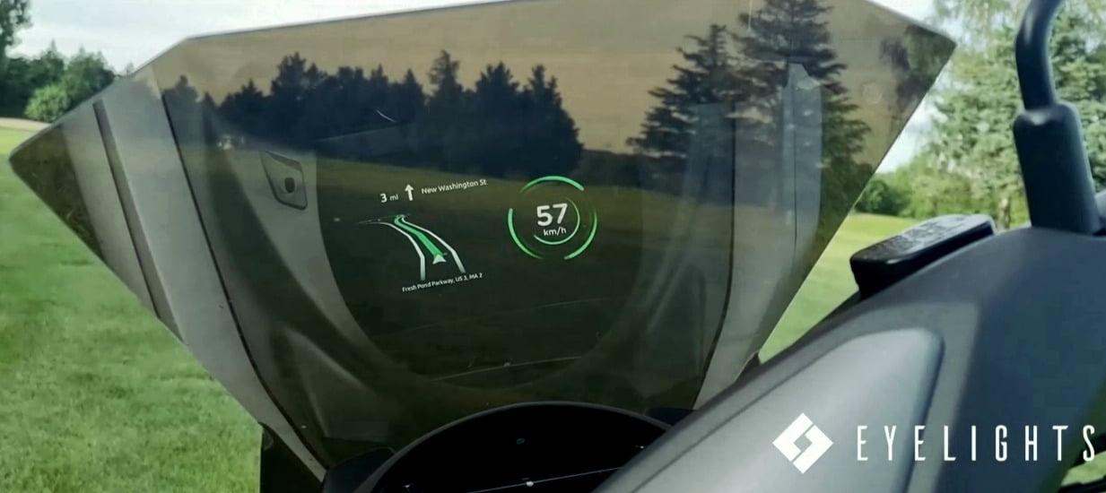 Cet affichage tête haute pour moto et scooter devrait arriver sur le marché au premier trimestre 2022. Cette solution technologique vient compléter l’offre nommée EyeRide et qui projette un affichage tête haute à l’intérieur du casque pour 499 €.