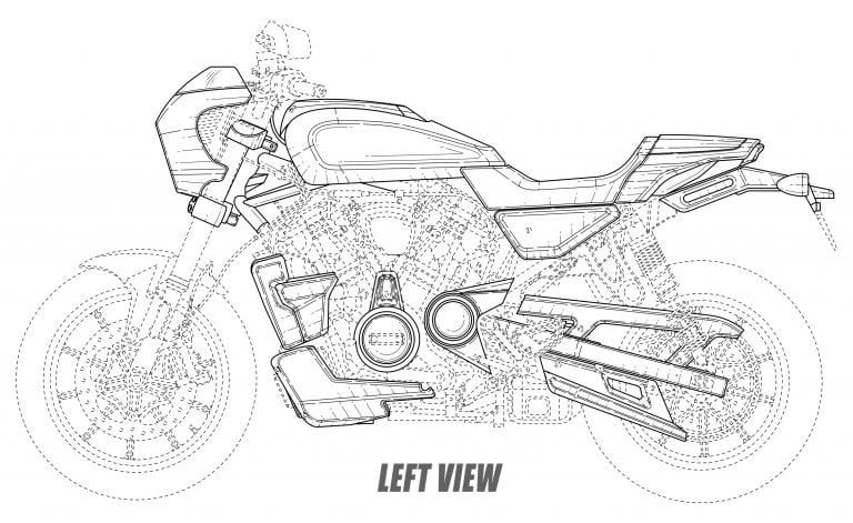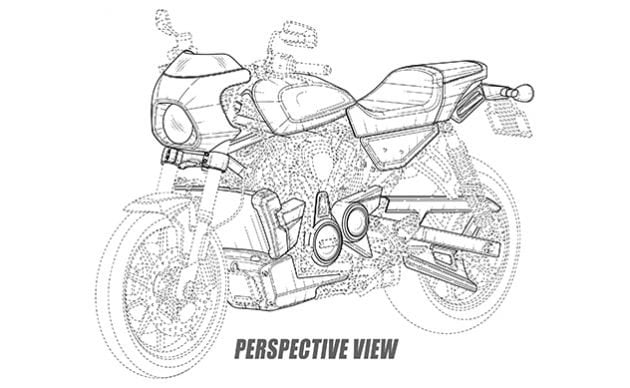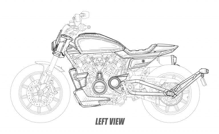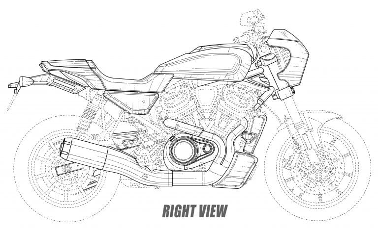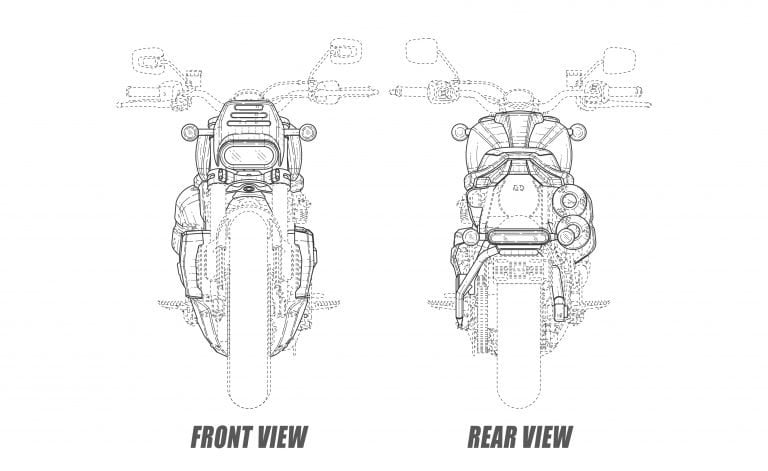Les dessins montrent des freins à disque avant doubles, bien que les lignes en pointillés ne permettent pas de bien voir les étriers. La suspension avant semble être une fourche inversée, et d’après les mesures du site motorcycle.com, elle semble avoir un angle d’inclinaison d’environ 23°. Pour A l’arrière, on devine un mono-amortisseur. Comme la FTR, le modèle Harley utilise un support de plaque d’immatriculation qui épouse le pneu arrière et qui est fixé au bras oscillant par un support tubulaire. Parmi les autres détails que l’on peut distinguer, citons un petit garde-boue avant, une selle pour un seul passager et une seule nacelle d’instruments circulaire.