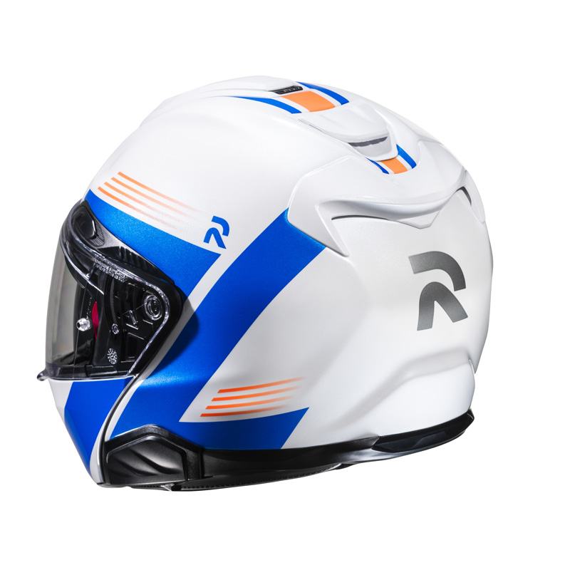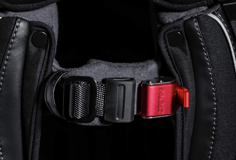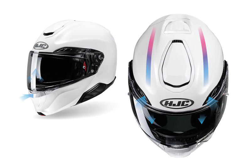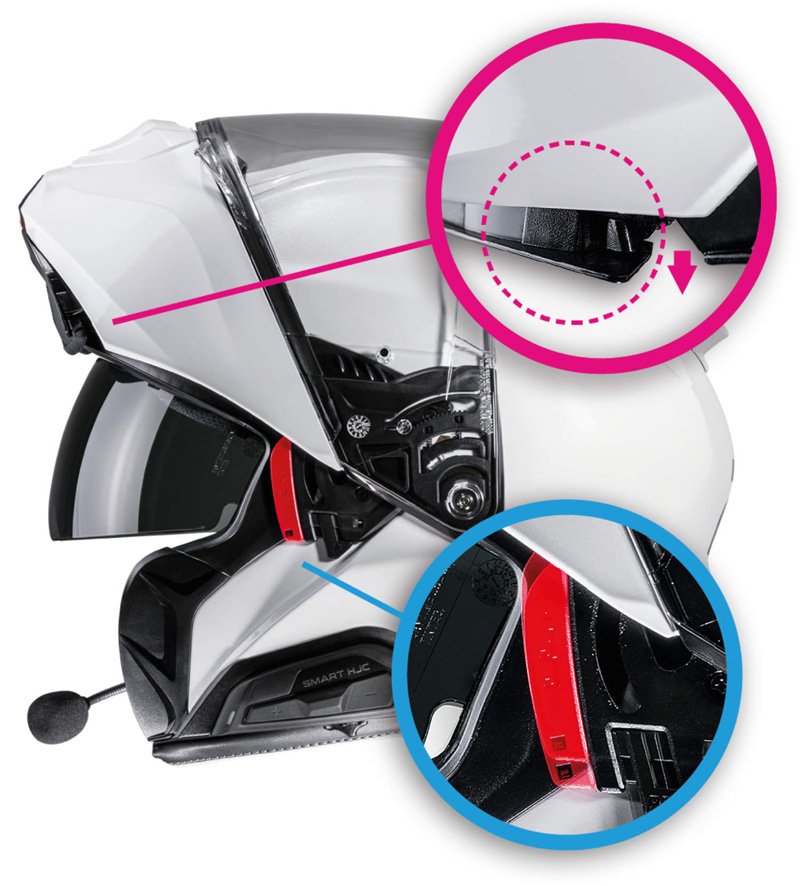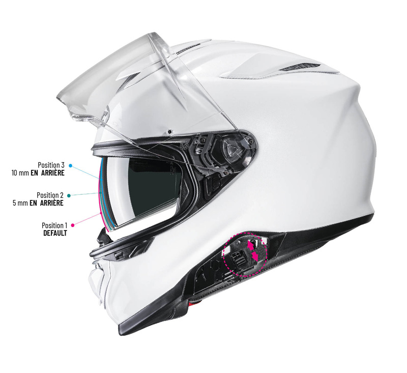 Et pour ceux qui aiment justement rouler avec la mentonnière relevée afin de profiter de leur trajet, HJC a totalement repensé le mécanisme de sa mentonnière. Celle-ci bénéficie désormais d’un système à double pivot : une fois en position haute, la mentonnière s’abaisse sur le dessus du casque. Résultat : une surface frontale réduite pour une faible résistance à l’air et un centre de gravité abaissé pour une moindre sollicitation du cou. Une fois la mentonnière relevée, le système de verrouillage inférieur se cache automatiquement pour réduire encore les bruits aérodynamiques.