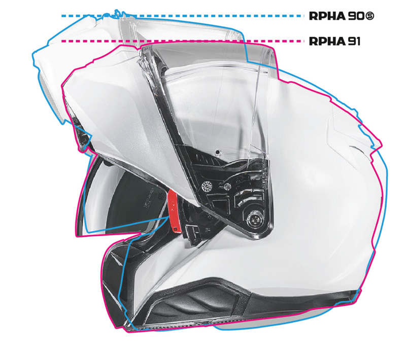 Si les RPHA 90 et sa déclinaison RPHA 90s avaient déjà prouvé la maîtrise par HJC des technologies de pointe pour apporter un maximum de confort aux inconditionnels du casque modulable Gt, le tout nouveau RPHA 91 démontre que le fabricant coréen ne se fixe aucune limite et maîtrise parfaitement la fabrication du casque modulable haut de gamme. Nouvelle coque, système de double pivot pour la mentonnière et intérieur totalement revu pour un maintien amélioré tout en réduisant la pression sur les joues : le modulable RPHA 91 rassemble tout ce qu’un motard peut attendre d’un casque adapté au quotidien comme aux longs voyages.