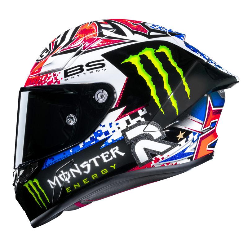 Proposé en série limitée sur une base RPHA 1, le modèle reprend le graphisme bleu-blanc-rouge du casque porté par le pilote seulement lors du Grand-Prix de France. Le diable sur le dessus, le numéro 20 à l’arrière et les logos Monster autour d’un fond tricolore avec une finition vernie brillante font de ce casque Replica une pièce exceptionnelle pour les supporters et collectionneurs.