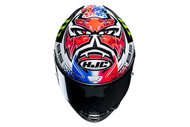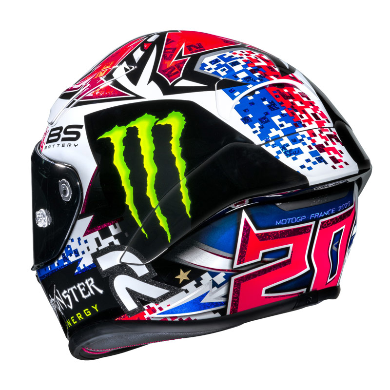 Proposé en série limitée sur une base RPHA 1, le modèle reprend le graphisme bleu-blanc-rouge du casque porté par le pilote seulement lors du Grand-Prix de France. Le diable sur le dessus, le numéro 20 à l’arrière et les logos Monster autour d’un fond tricolore avec une finition vernie brillante font de ce casque Replica une pièce exceptionnelle pour les supporters et collectionneurs.