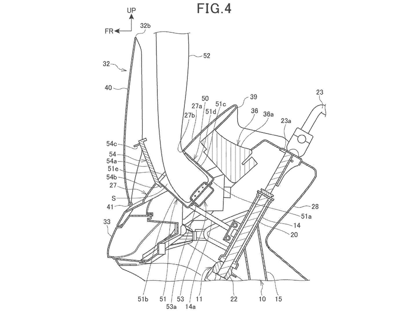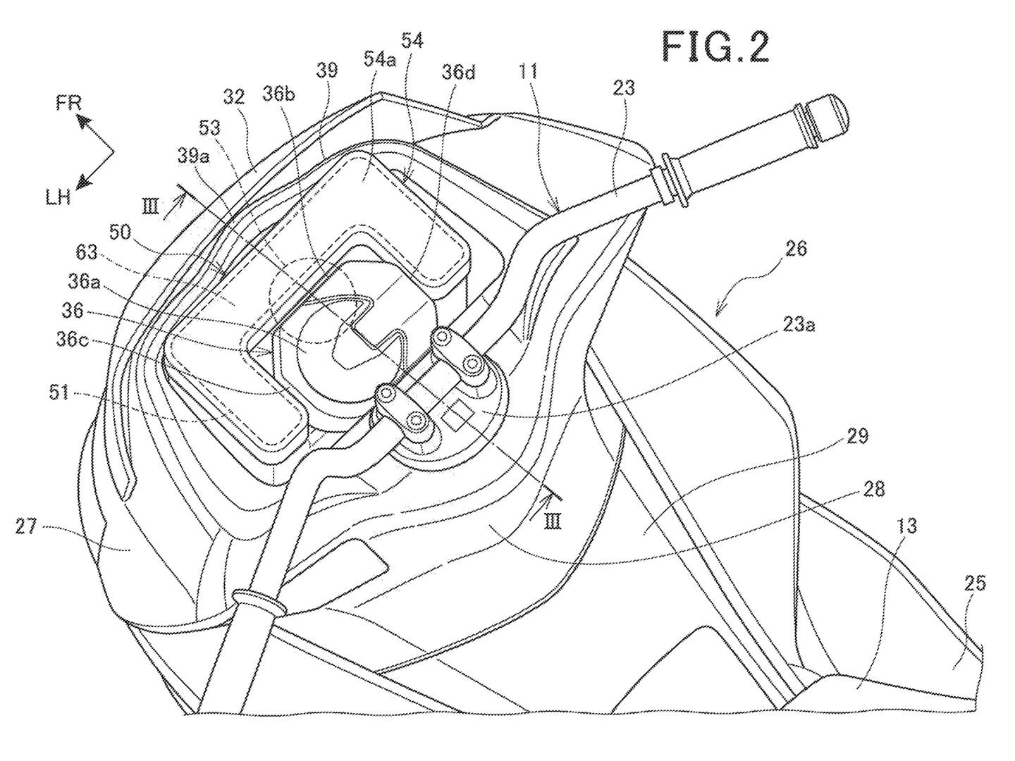 Les nouveaux brevets se concentrent sur la façon de positionner l’airbag pour obtenir le « mur » de protection de style rideau. Dans le premier, l’airbag est positionné juste devant le guidon et se replie dans une enceinte en forme de C qui entoure le tableau de bord, la structure de l’airbag étant intégrée au support qui maintient le tableau de bord. C’est cette intégration qui constitue la base du brevet.