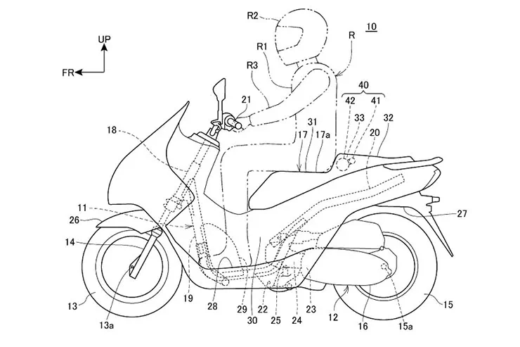La solution de Honda à ces problèmes a émergé dans une multitude de nouvelles demandes de brevet, montrant plusieurs points de vue différents sur la même idée. Le concept de base est d’avoir un airbag qui est intégré dans la selle d’une moto mais qui s’enroule autour du pilote en cas d’accident, se détachant de la moto au cours de la chute pour protéger l’utilisateur même lorsqu’il a été éjecté.