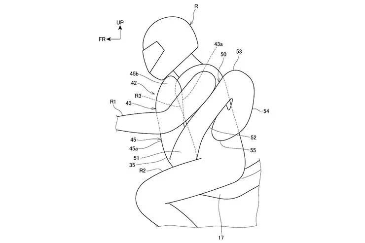 La solution de Honda à ces problèmes a émergé dans une multitude de nouvelles demandes de brevet, montrant plusieurs points de vue différents sur la même idée. Le concept de base est d’avoir un airbag qui est intégré dans la selle d’une moto mais qui s’enroule autour du pilote en cas d’accident, se détachant de la moto au cours de la chute pour protéger l’utilisateur même lorsqu’il a été éjecté.