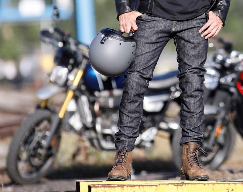 – Jean moto fait avec un mélange de Dyneema/Denim, 68 % coton, 25 % polyéthylène, 5 % polyamide, 2 % élasthanne