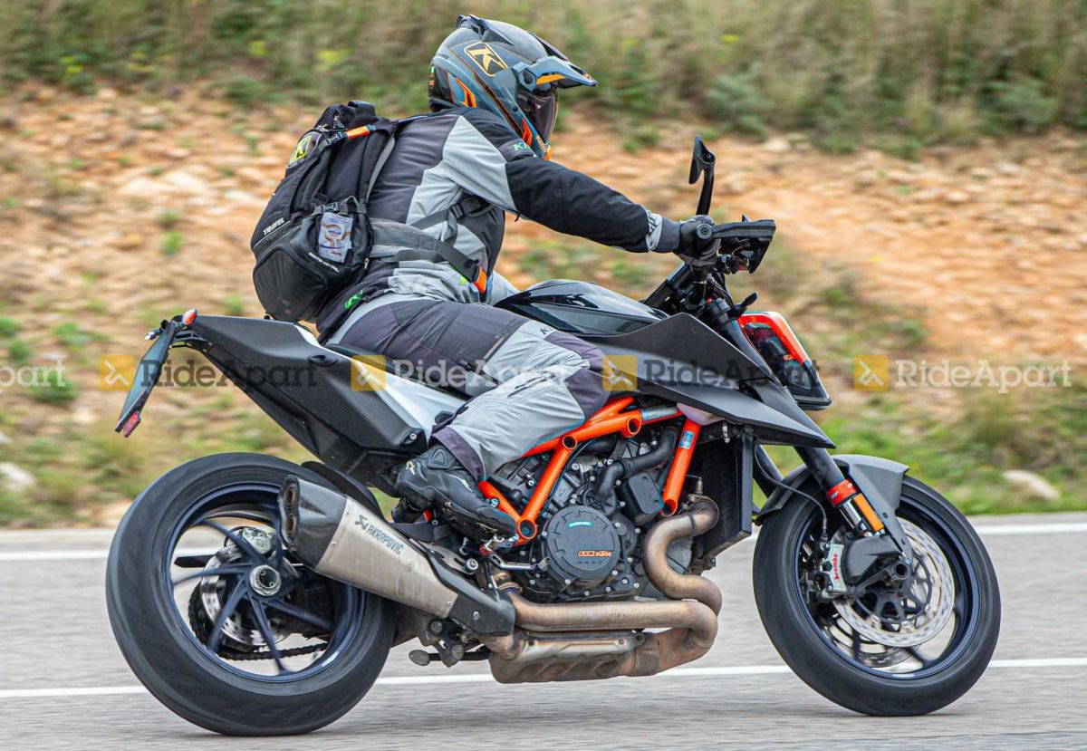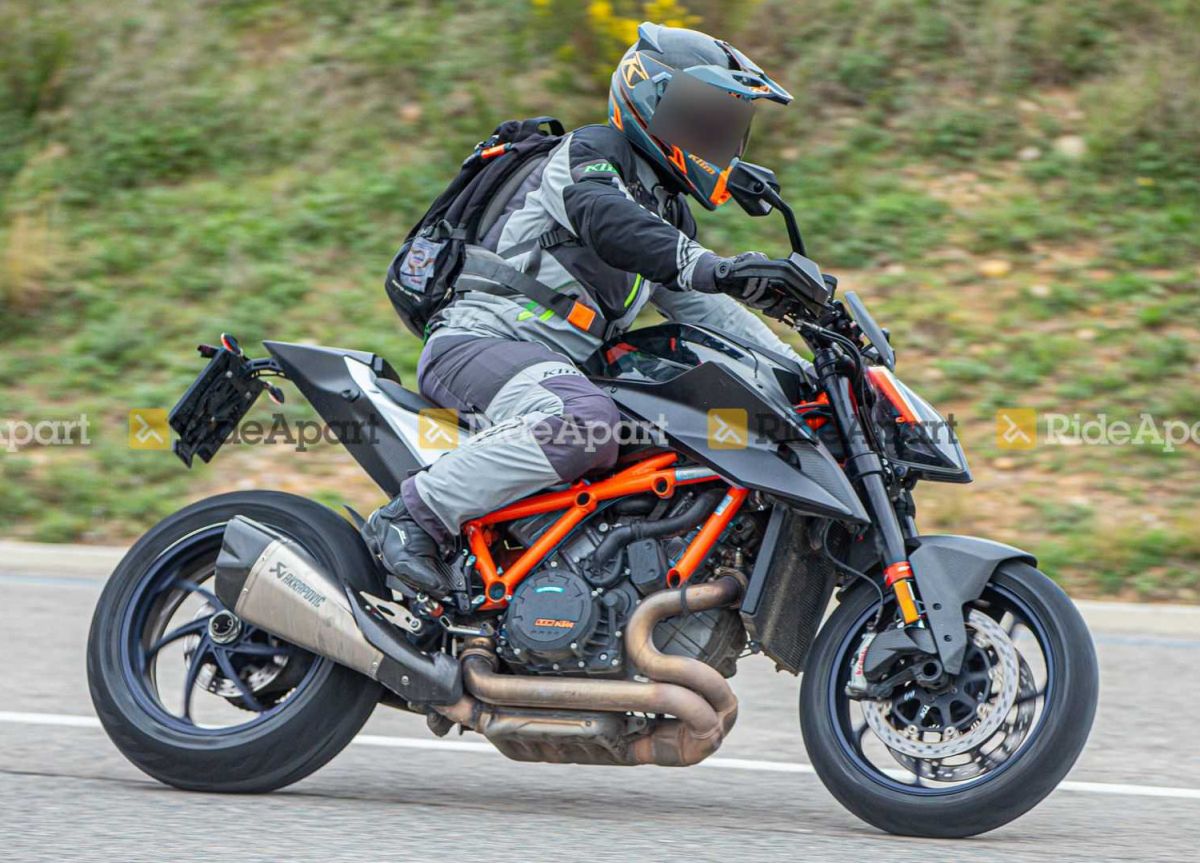 Le nouveau roadster naked du constructeur autrichien a été photographié par RideApart lors de tests routiers. Après avoir découvert son existence à partir de certains documents d’homologation provenant d’Allemagne, voici la première photo de la version la plus affutée de la famille SuperDuke. Cette version RR possède de nombreux éléments en carbone, les principaux ingrédients de la cure minceur qui font perdre beaucoup de poids au SuperDuke, en le faisant descendre sur la balance à 170 kg à sec. Un chiffre qui améliore considérablement le rapport poids/puissance, étant donné que le bicylindre en V LC8 de 1301 cc est capable de délivrer pas moins de 180 ch.