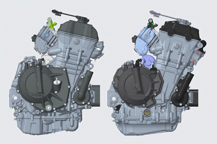 Vu du côté droit, les modifications comprennent une nouvelle culasse, de nouveaux cylindres, de nouveaux carters. En fait, alors que la disposition est généralement similaire à l’ancien modèle, il n’y a pratiquement rien de reporté à part les pièces boulonnées comme le couvercle de la pompe à eau, les bobines d’allumage et les corps de papillon.