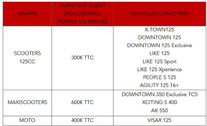 – Gamme Scooters 125cc, 300 euros TTC d’avantage client (hors nouveau X-Town City 125)