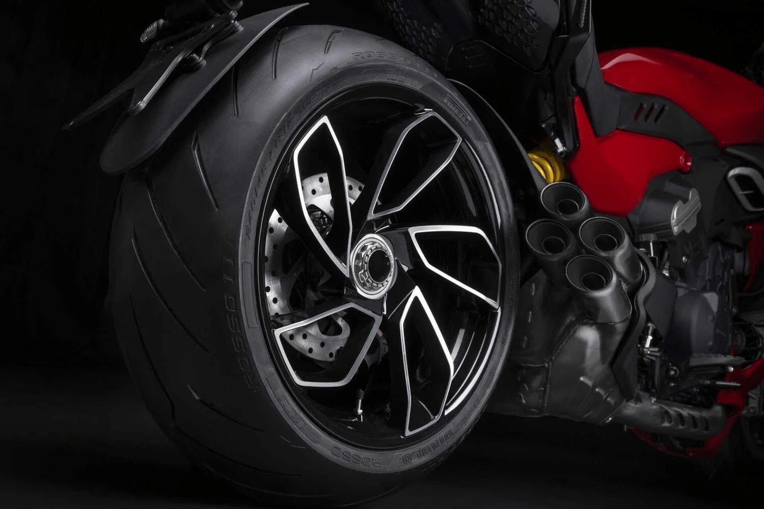 L’impressionnant pneu arrière 240/45-17, autre élément distinctif des Ducati Diavels, est toujours présent sur ce modèle. Les jantes sont en alliage léger à cinq branches, avec un profil agrémenté de surfaces usinées.