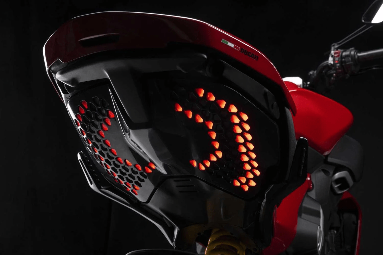 Comme la première V2, la Diavel V4 s’inspire de l’univers des muscle cars et, vue de profil, elle re-propose l’image d’un athlète prêt à sprinter dès les starting-blocks. La nouvelle signature des blocs optiques avant et arrière est en double C et les clignotants sont full Led. Le feu de jour avant change de forme, avec un profil en double C, une évolution du design précédent. De manière originale, le feu arrière est signé par une matrice LED en forme de points logée sous la boucle arrière : dans ce cas également, la signature optique rend le nouveau Diavel immédiatement reconnaissable. Les clignotants dynamiques sont intégrés au guidon, devant les réservoirs des commandes hydrauliques de frein et d’embrayage.