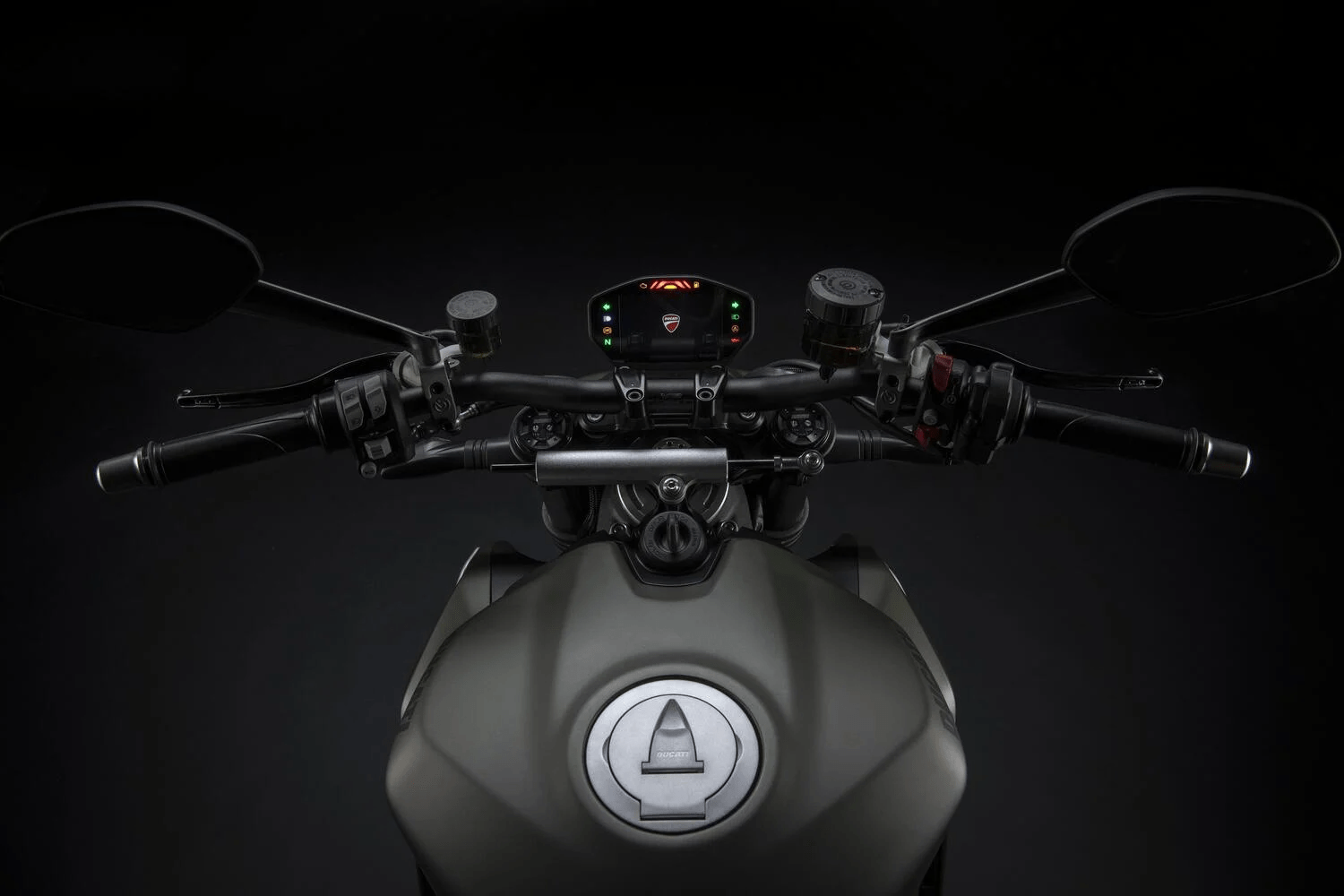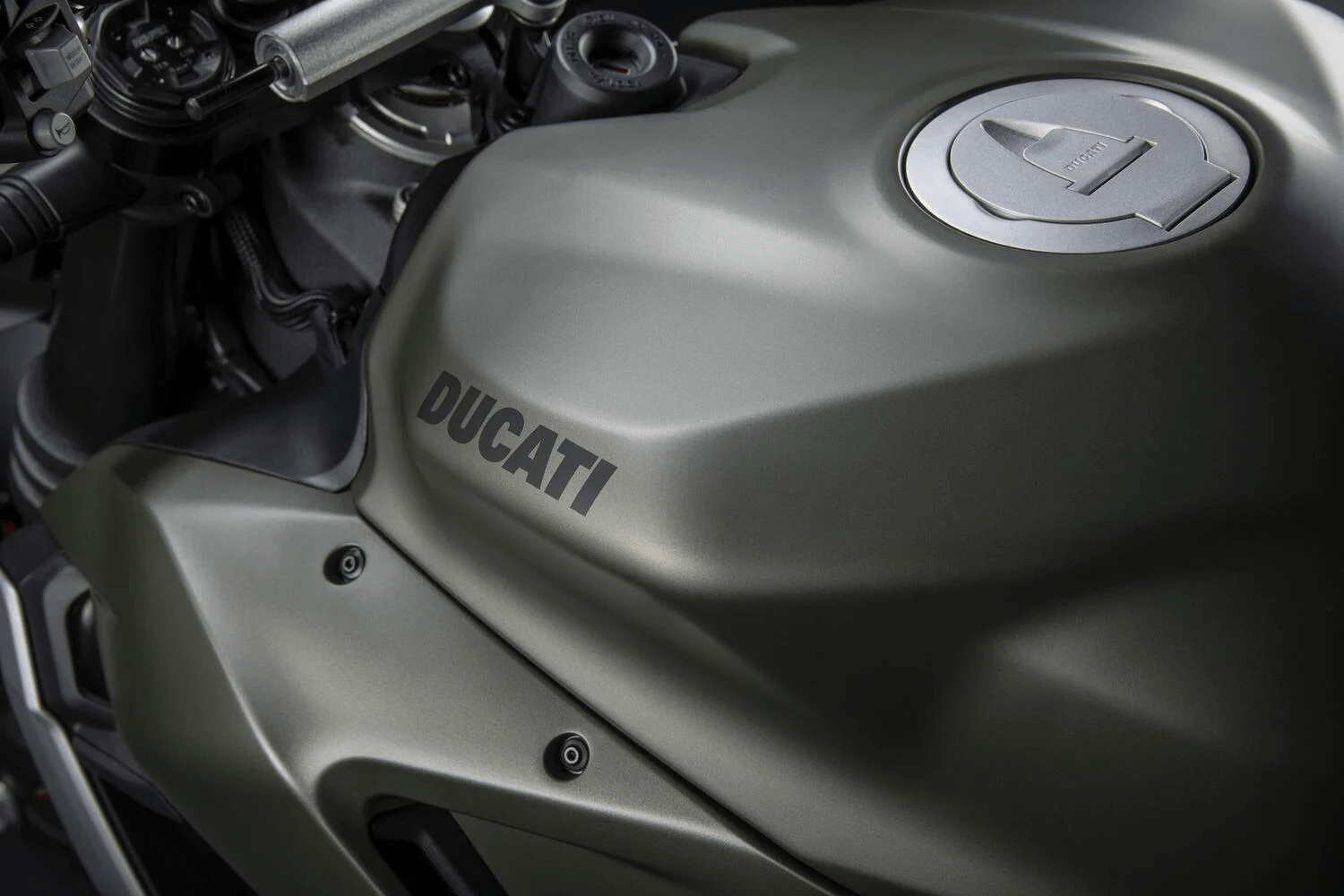 Pour certains, la nouvelle couleur peut être un simple vert kaki, mais le Centro Stile de Ducati était catégorique quant à son choix. Selon la firme de Bologne, « le grain métallique crée un jeu de contrastes très évident » tandis que la finition mate se marie avec « le contexte chromatique des pièces mécaniques ». Ducati n’a pas pu s’empêcher d’ajouter une touche de rouge, faisant allusion aux racines de performance de la marque.