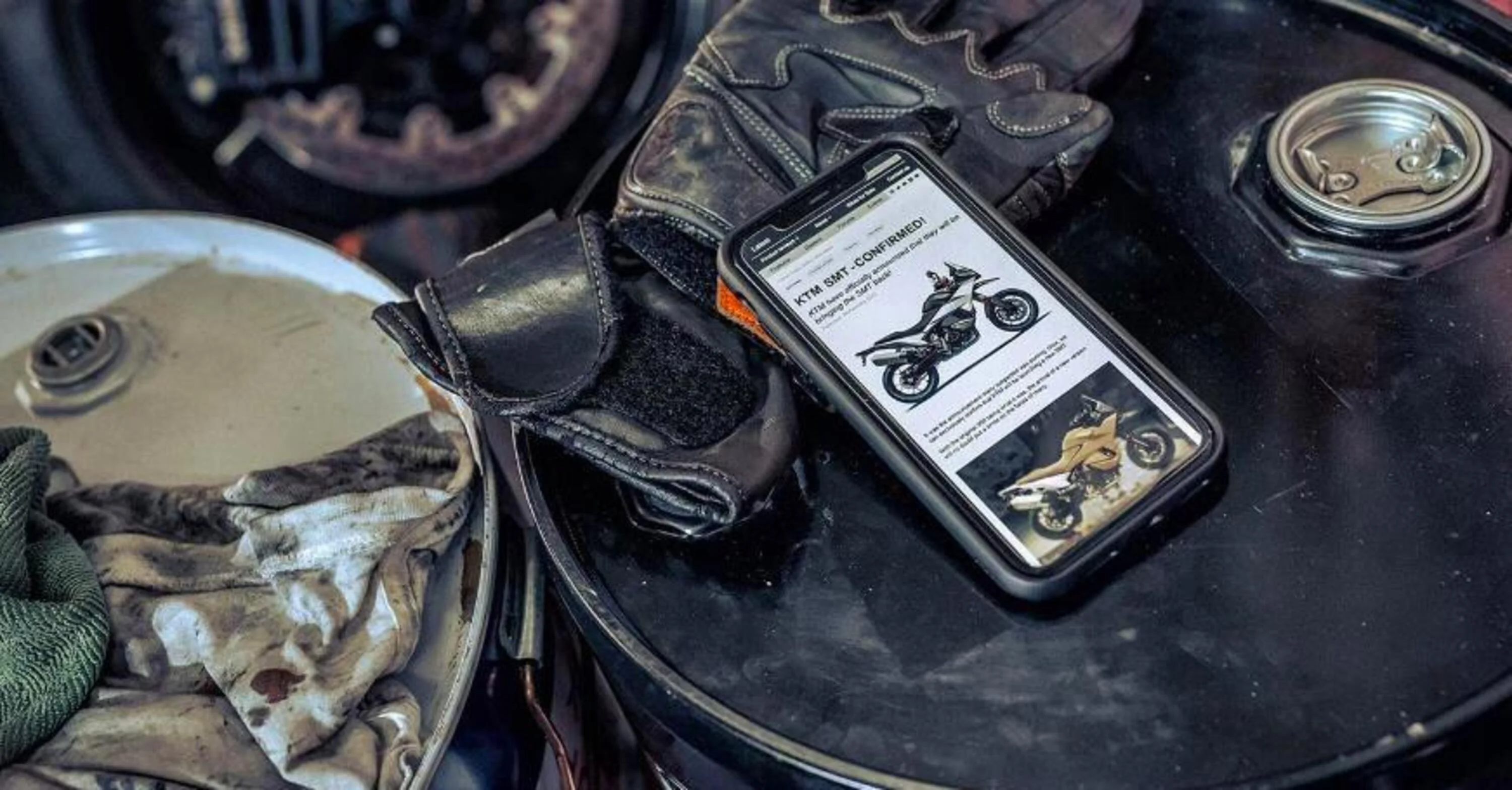 Le teaser publié par KTM prend la forme d’une vidéo montrant un reportage fictif sur la SMT qui est apparu sur le téléphone d’un fan. La vidéo laisse entrevoir un croquis stylistique et une maquette en terre cuite du nouveau modèle, que l’on retrouve au vernissage.