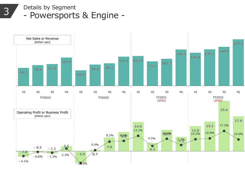 Mais non ! Powersports and Engine (motos, véhicules tout-terrain à quatre roues, jet skis et moteurs à essence à usage général), l’une des six divisions du groupe, a représenté près d’un tiers (34 %) du chiffre d’affaires total (ventes) de Kawasaki en 2022. Mieux, ce même segment représente 70 % du bénéfice total de l’entreprise. En d’autres termes, les motos, les quatre roues et les jet-skis gagnent le double des bénéfices des 5 autres divisions combinées ! Y compris la construction navale et l’aérospatiale. On n’imagine pas s’ils revenaient en MotoGP, car ils en ont largement les moyens, du moins financiers…