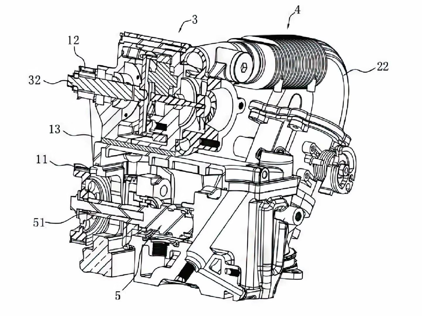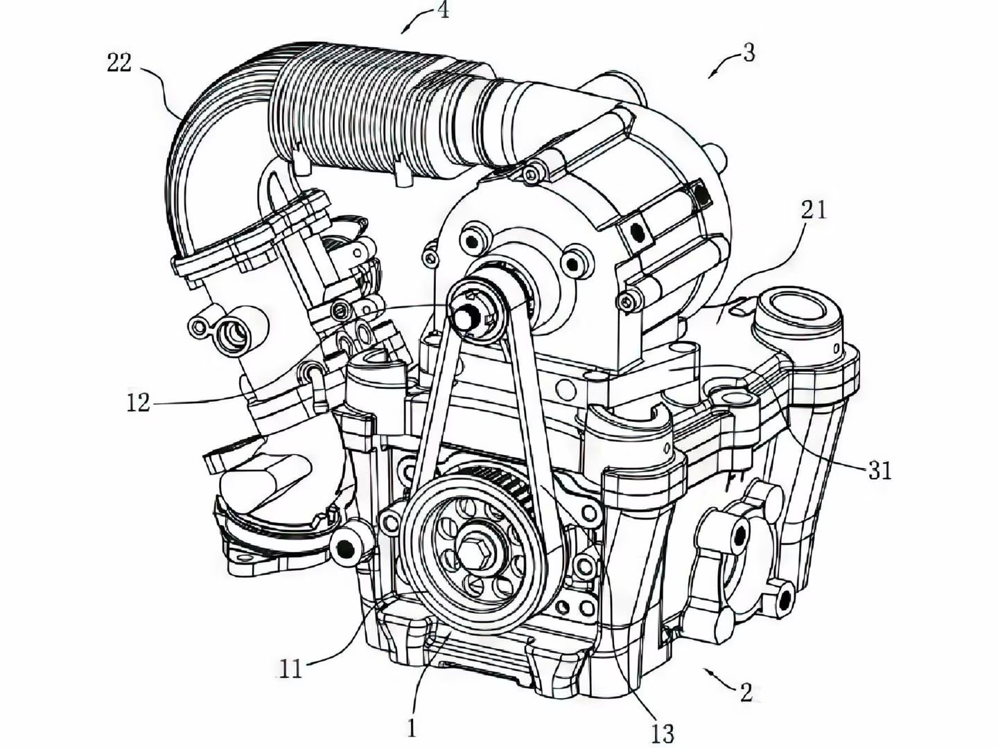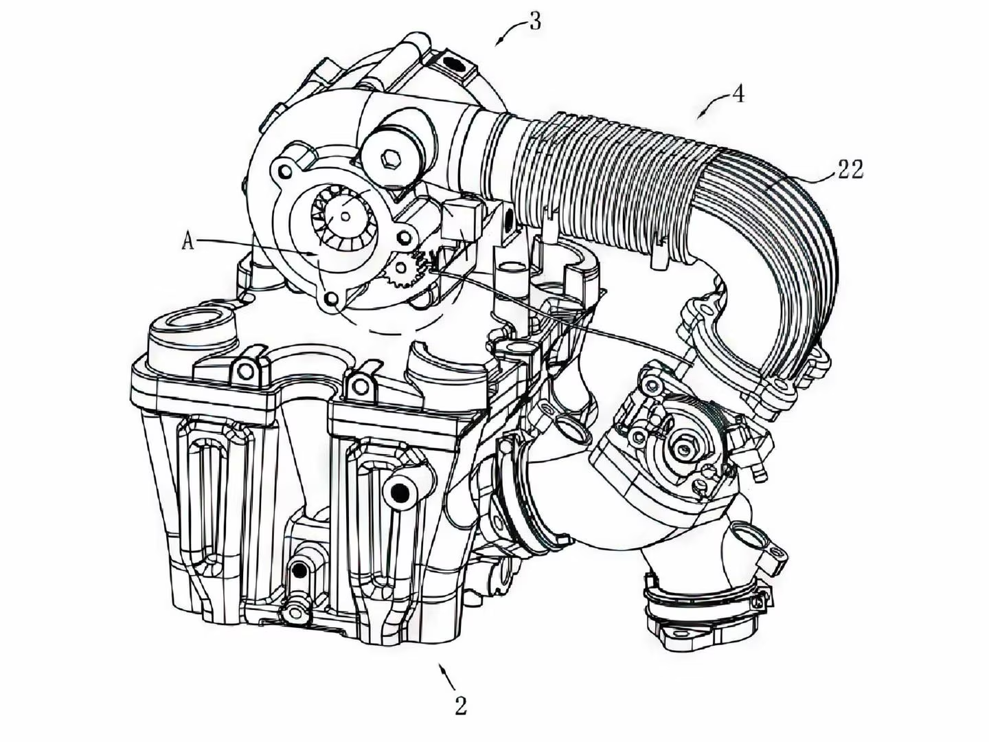 Encore une fois, cependant, des indications intéressantes arrivent des demandes de brevet. Il y a un an, le design de cette moto était enregistré et maintenant c’est au tour du moteur qui a vraiment des idées très intéressantes. Il s’agit en soi du même bicylindre en V de 60° de 298 cc, à distribution simple arbre à cames en tête et refroidissement liquide, monté sur les autres modèles de la marque. Les dessins, cependant, illustrent que la suralimentation ne serait pas mise en œuvre avec un turbocompresseur comme le nom de la moto l’indique, mais avec un compresseur centrifuge. Ne soyez pas scandalisé : les Chinois ne sont pas trop rigoureux dans leur utilisation des mots occidentaux et peut-être ont-ils fait quelques confusions, mais c’est encore une définition provisoire.