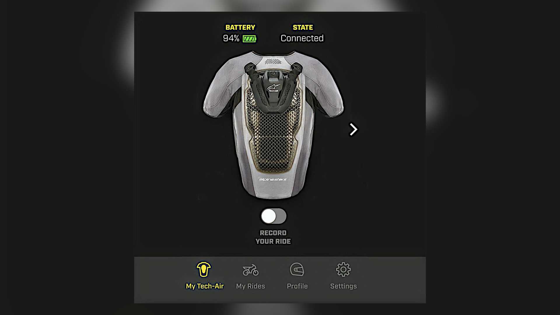 Il se porte sous n’importe quelle veste ou combinaison en cuir et, grâce à la connectivité Bluetooth intégrée, permet aux pilotes de visualiser l’état de fonctionnement du Tech-Air 5, l’état de charge de la batterie, ainsi qu’une carte détaillée de leur balade, consultable sur le téléphone à partir de l’application Tech-Air.